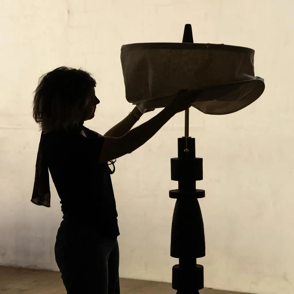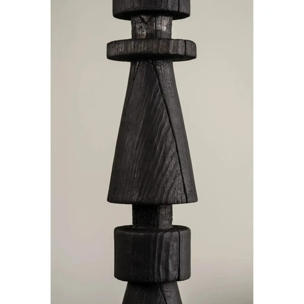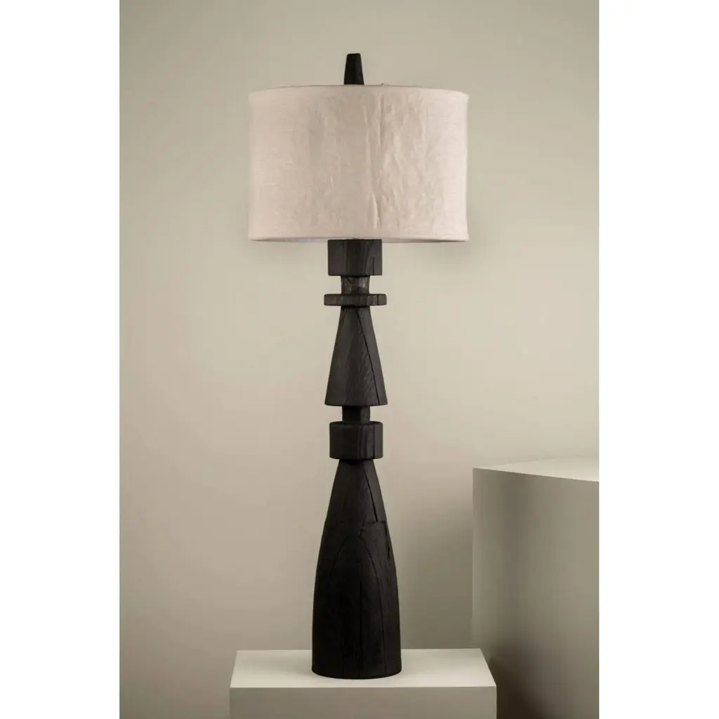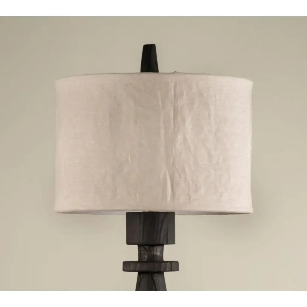 Mezquite Sculptural Pine Wood Floor Lamp with Linen Shade by Isabel MoncadaDimensions: Ø 60 x H 181 cm.Materials: Linen and pine wood.Like a chess bishop, Mezquite makes its presence felt in a resounding manner. It has a sturdy wood base, its dark finish gives great character and its edges are embossed when burned with the Japanese Shou Sugi Ban technique.Turned pine wood base with burnt finish and flexible lampshade made with natural linen fabric. The linen shade can be disassembled to be dry-cleaned and can be steamed to remove wrinkles.All our lamps can be wired according to each country. If sold to the USA it will be wired for the USA for instance. Please contact us. Isabel Moncada is a Mexican designer specialized in lighting.By exploring and finessing traditional manufacturing techniques, Isabel has developed her own mechanisms and transformed materials to improve her designs as well as carve out her personal style.