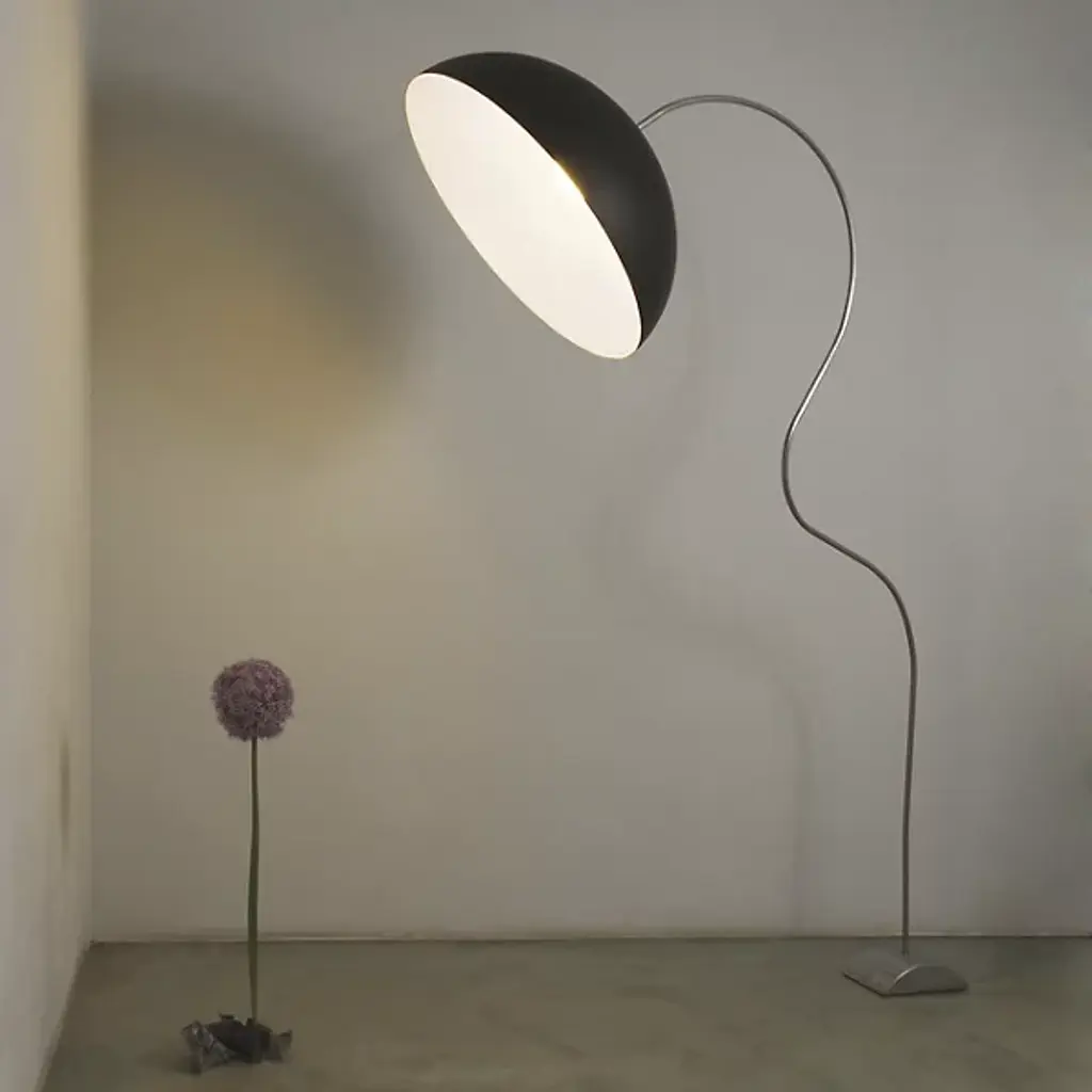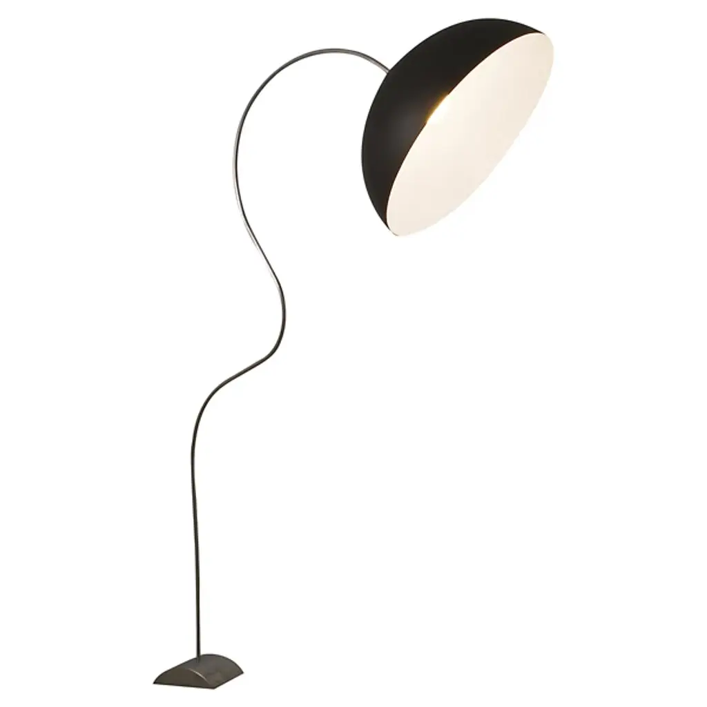 The Mezza Luna Piantana Floor Lamp from In-Es Art Design breathes life into its surroundings with its playful curves and elegant design. A large dome-shaped shade made of steel boasts a smooth painted exterior with a contrasting inner shade made of resin and fiberglass called Nebulite. The textural interior captures its light and displays a vibrant swirling pattern that adds visual depth. Its curving stem rises from an arched base to bring a sense of movement and whimsy to its simple aesthetic.