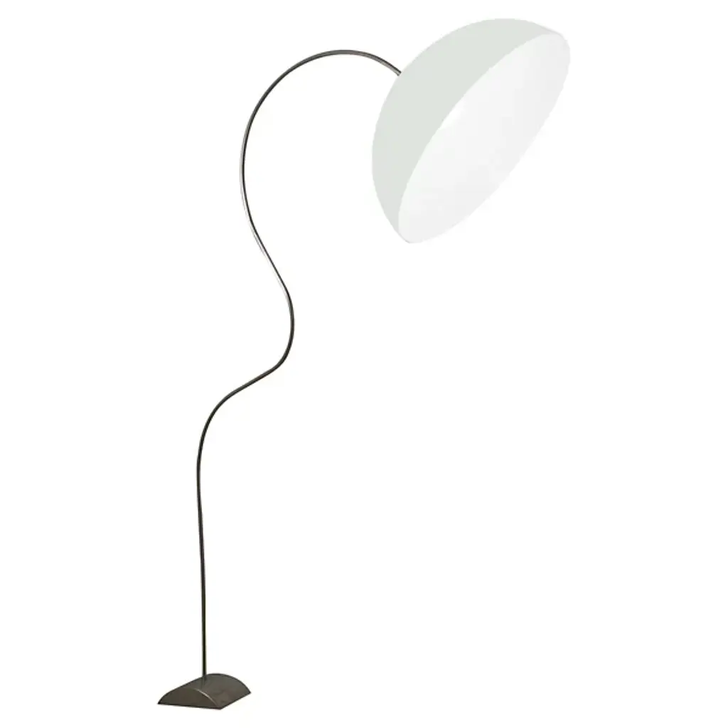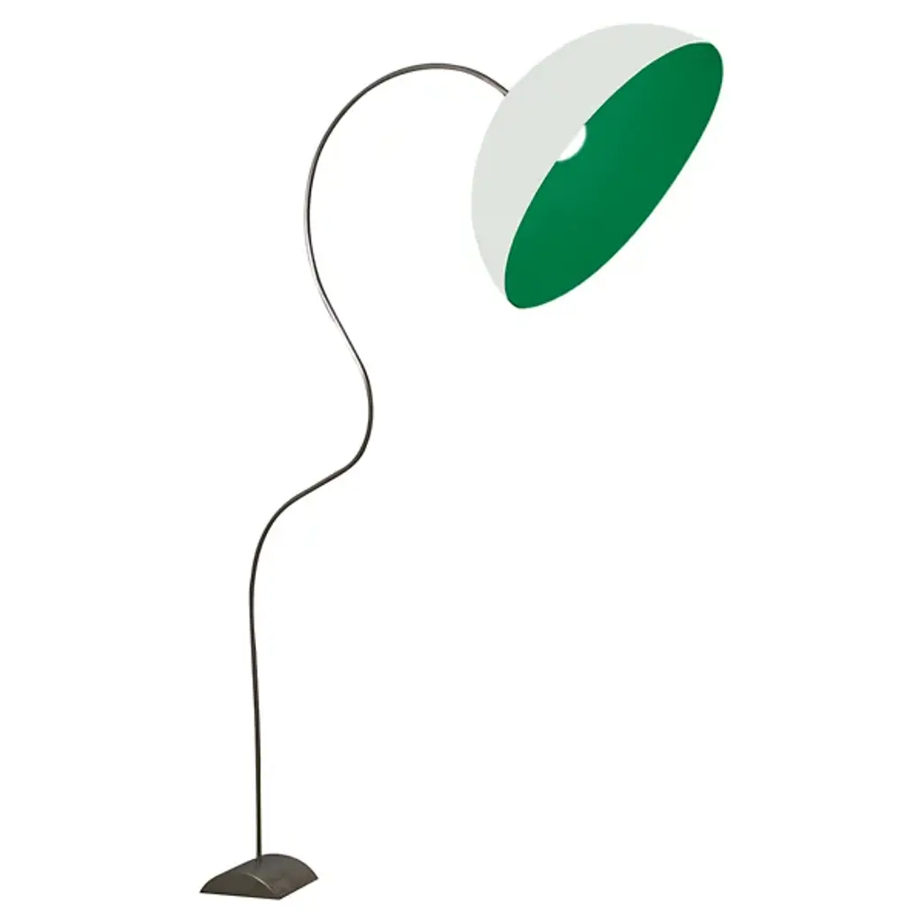 The Mezza Luna Piantana Floor Lamp from In-Es Art Design breathes life into its surroundings with its playful curves and elegant design. A large dome-shaped shade made of steel boasts a smooth painted exterior with a contrasting inner shade made of resin and fiberglass called Nebulite. The textural interior captures its light and displays a vibrant swirling pattern that adds visual depth. Its curving stem rises from an arched base to bring a sense of movement and whimsy to its simple aesthetic.