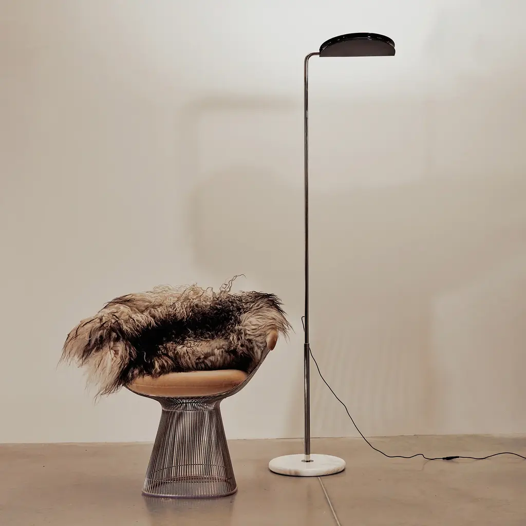 A unique design from every angle, the Mezzaluna Floor Lamp from DCW editions brings versatile lighting design to any corner of your home. A reissue of the iconic Italian floor lamp from the 1970's, this stunning luminary boasts a half-moon enamel shade and sleek marble base for unmatched stability. Fully customizable, the height is adjustable, while the shade tilts up and down, acting as both a reading lamp and ambient lighting. Updated with LED technology, this lamp is equipped with a slide dimmer on the lamp head to set the perfect mood for any occasion. Highlights