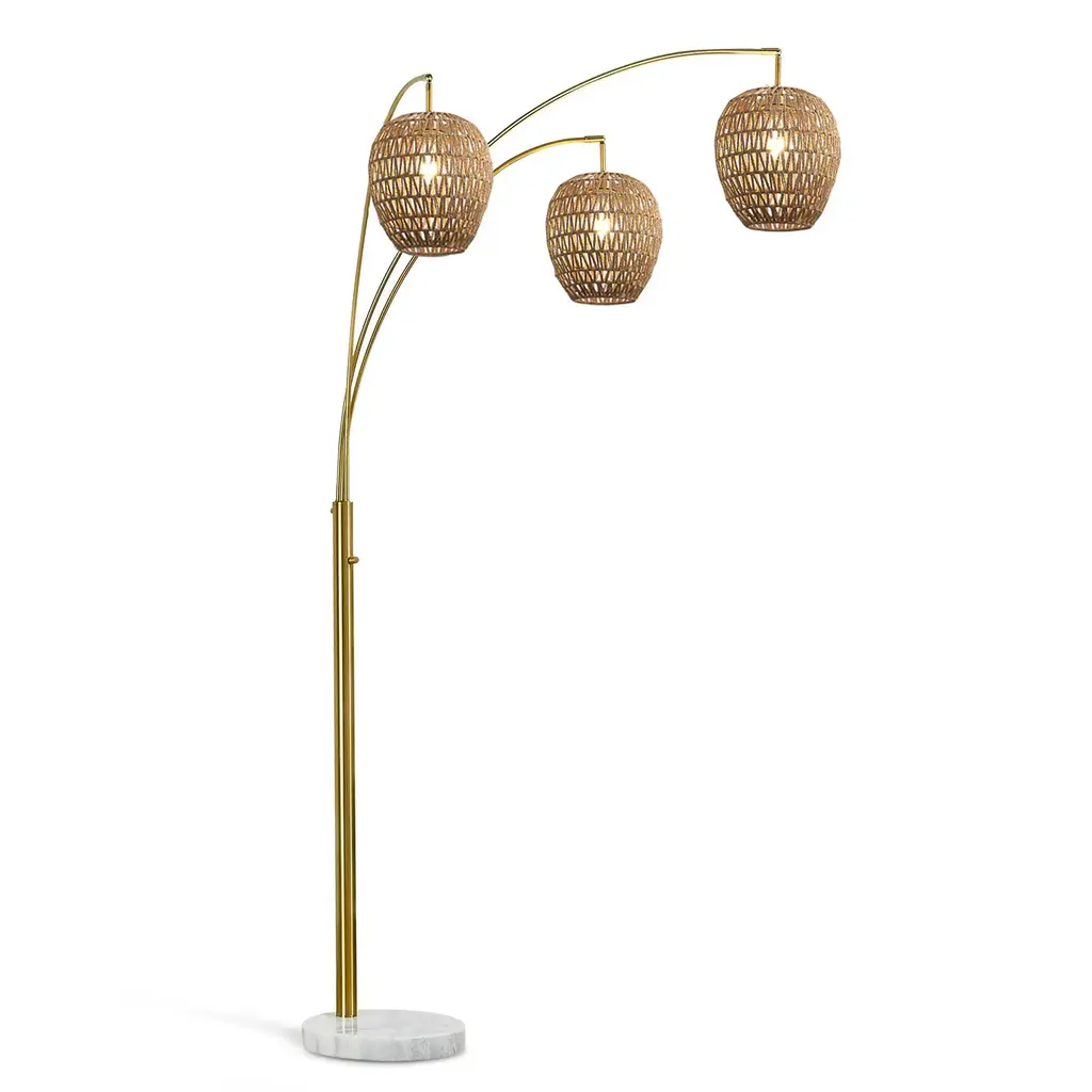 A delicate interplay of volumes and textures catches the eye in this magnificent floor lamp that creates a mesmerizing ambiance light in any room in the house. The structure in brass with a round base and elongated stem opens up at the top in two curls that receive the two stunning shades in fine porcelain adorned with a grooved diamond-patterned surface, each diffusing a single light.