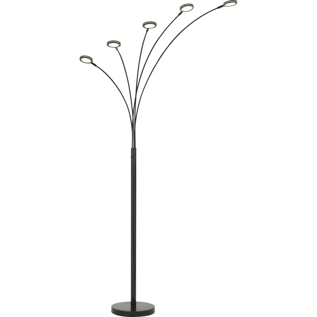 "Light up your living room, bedroom or office with this sleek and modern LED 5-Arched Modern Brushed Black Satin Nickel Floor lamp from Artiva USA. A perfect addition to any rooms with modern or contemporary decors . The Micah Plus LED floor lamp hold super bright and warms LED lights with dimming function. The curved design adds a soft note to your decor. Standing over 7 feet, the fixture has a statuesque appearance that draws attention. This Artiva USA exclusive design LED floor lamp allows you to direct the light wherever you need it and provide ample lighting for reading, writing or create a spot light in the setting behind the couch, in the corner or in the center of your living room. Heavy weighted base grants perfect balance and prevent the lamp from tipping. An Artiva USA exclusive, five true 360-degree beam view angle LED bulbs included(LED-G9-5TDM-30). US Patented Design. US Patent# US D753,867 S5 Artiva USA exclusive 5 watts(2500 Lumen) True 360 Degree view LED bulbs(LED-G9-5TDM-30) included with Dimming functionUse 10 times less energy than regular bulb(40 watts replacement used only 5 watts of energy each)Compare to 200W lamp, this artiva LED lamp uses only 25W of electricity(2500 Lumen of Brightness) and will save you over $42 every year off of your electric bill (based on 6-hours per day usage and 11 cents per kilowatt) . The most efficient and brightest LED in the marketAdjustable Ach (left or right only)and adjustable shade (360 degrees)Measurement overall : 54"x54"x88"H, BASE:15"X15"X2"HBeautiful Brushed Black Satin Nickel finish. Full Range Dimmer.US Patended Design. US Patent# US D753, 867 S"