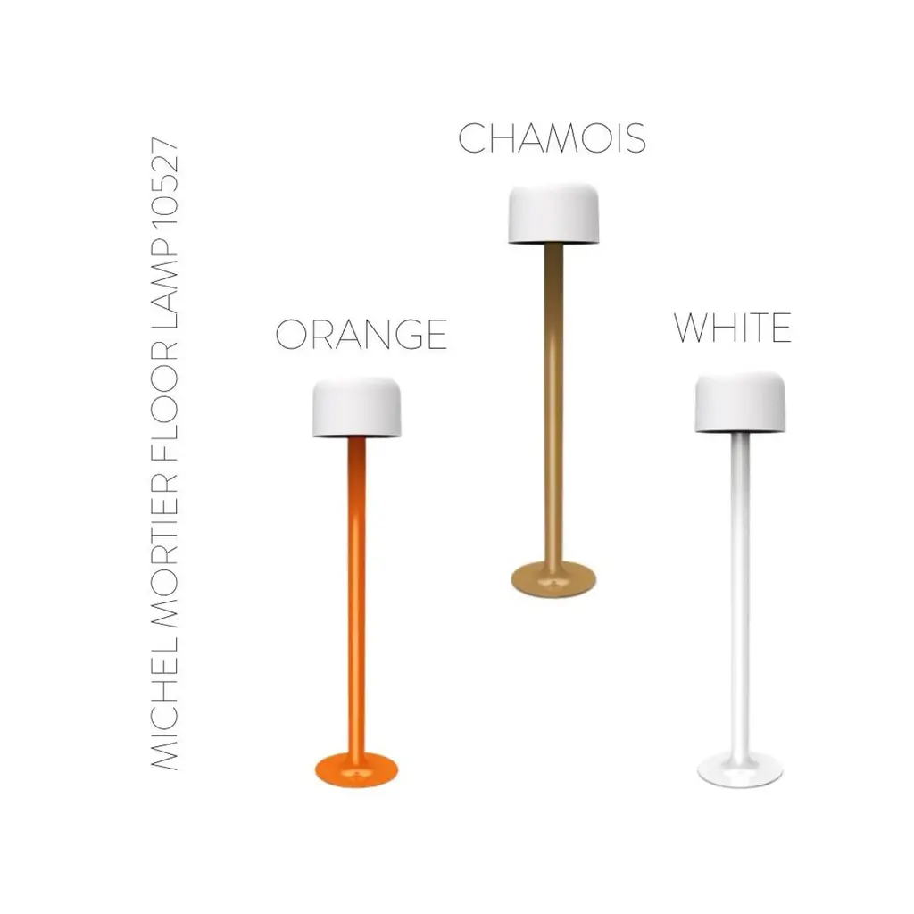 Michel Mortier 10527 metal and glass floor lamp for Disderot in chamois.Originally designed in 1972, this sculptural floor lamp is a newly produced numbered edition with an authentication certificate. Made in France by Disderot with many of the same small-scale manufacturing techniques and craftsmanship as the original run. Executed in spun aluminum and opaline glass. As with the original design, the base is available in white, orange, or chamois.Price is per item. Available in unlimited quantities.Comes in the manufacturer's box with a “Certificate of Authenticity”. Professionally modified for US electrical. Accommodates 3x6W standard medium base LED bulbs. Dimmer switch. Not UL listed, but recommended UL listing possible from authorized 3rd party vendor upon request for an additional fee.Please note, due to the size and shape of the glass shade, it must be shipped in a wooden box from Disderot's European warehouse, resulting in additional shipping & handling costs. 1st Dibs arranged shipping and local pickup is not an option.In-stock lead-time 7-8 weeks. Out of stock can take up to 12 weeks or more. Note that stock availability can change at any time.Made to order. All sales are final.
