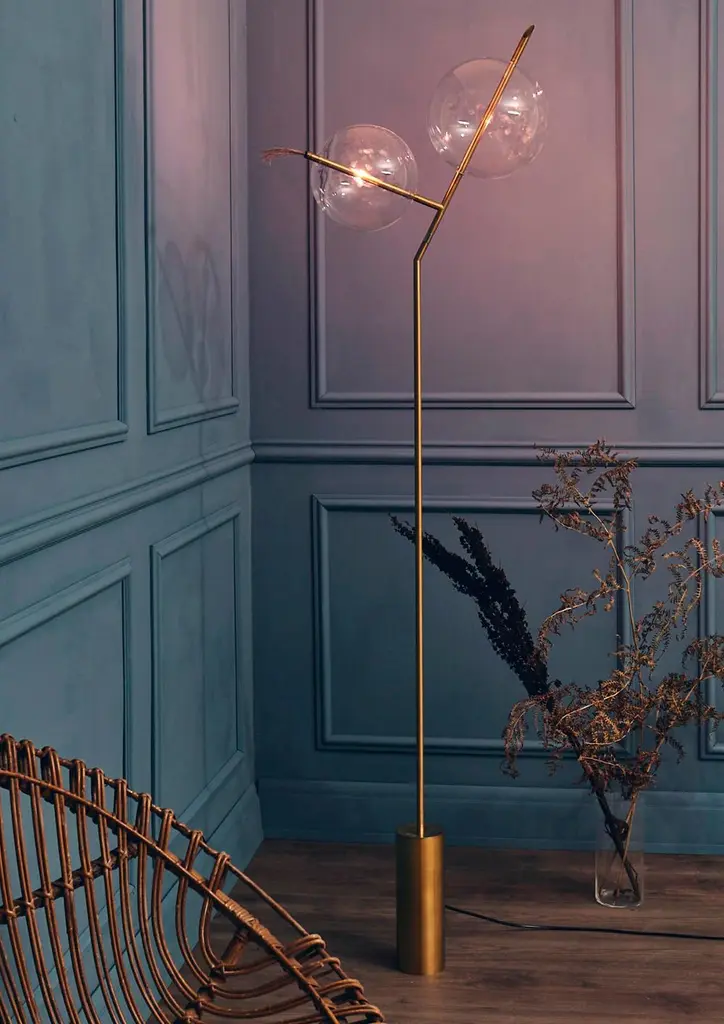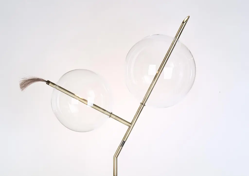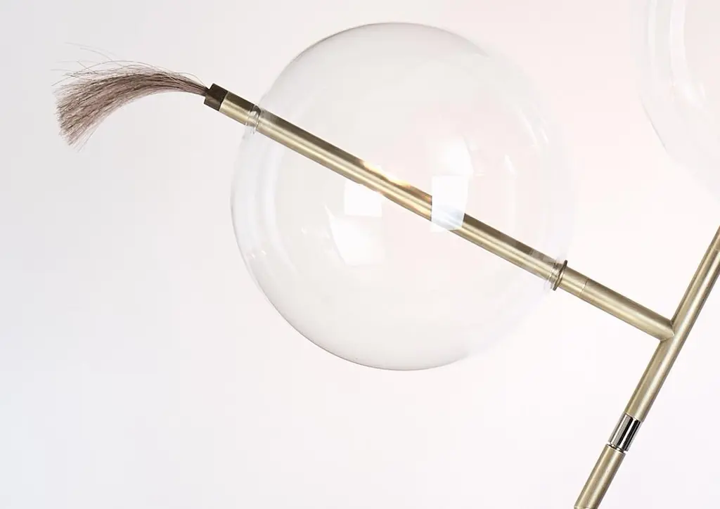 A playful nod, as the name suggests, to the world of cartoons, Mickey floor light is a contemporary standing lamp composed of two closely positioned glass spheres of different sizes.The detail in horsehair hides a touch sensor, which allows you to turn on, turn off and dim the light, simply by touching It.This lamp has one LED light source in each glass globe housed inside the rod. The light gets out from the brass rod crossing over the handblown glass, and through it is diffused softly.The direction of each light can be adjusted separately, while the Lower “Arm” can be rotated around the Axis of the pole and fixed in the preferred position.The base is Brass and contains the transformer. It is available in various finishes; below you can see the different prices. Please refer to us for detailed photos of the finishes.The Chemistry series grew out of an exploration of the forms and Proportions created by the Traditional handblown glass techniques still used to produce Glass in Vicenza, Italy.The brass is brushed with a wax coating to slow down the natural oxidation process, thus creating an alluring finish that ages gracefully over time. Dimensions: H 74”, 22”, 10” H 187 cm, 56 cm, 26 cm Weight: 22lb, 10 kgLed light type: Proprietary 24vcc led, two x 5 W, 2700k supply: 100-240v 50/60hzLight control: Dimmable touch sensorMaterials: Machined brass, handblown glassAll brass finishes are unlacquered and hand sealed with a light layer of wax. The finish is live and is intended to Patina Over Time.Lacquered finish available upon request.Mickey floor light is finished and assembled by hand in our studio in Italy. Each piece is made to order and customizations are available.Custom orders require a 50% non-refundable deposit.