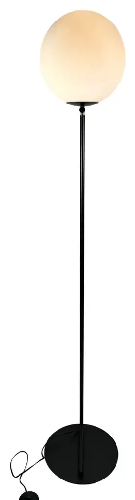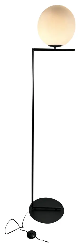 From the Mid Century Collection here is our popular Floor Lamp with single light and white glass frosty globe, now available in Matt Black with E12 lamp holder (medium base). A square arc type tall body with black finished. At the top of the lamp a white 12 in. glass globe with frosted texture. It comes with a black cable with plug and ON/OFF push-on button. This lamp is great for living areas, bedroom or dinning room. Also great for Mid Cuentry, Industrial or Transitional environments.