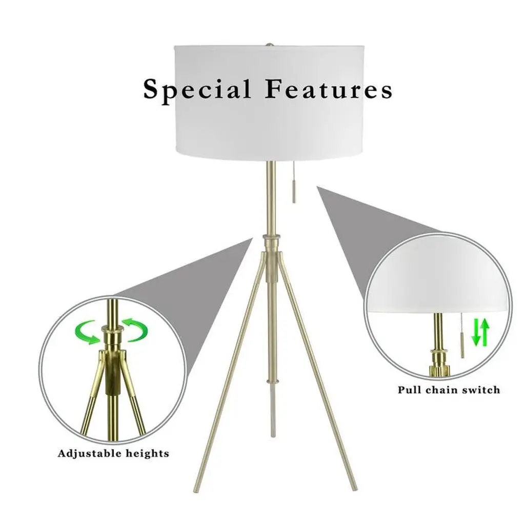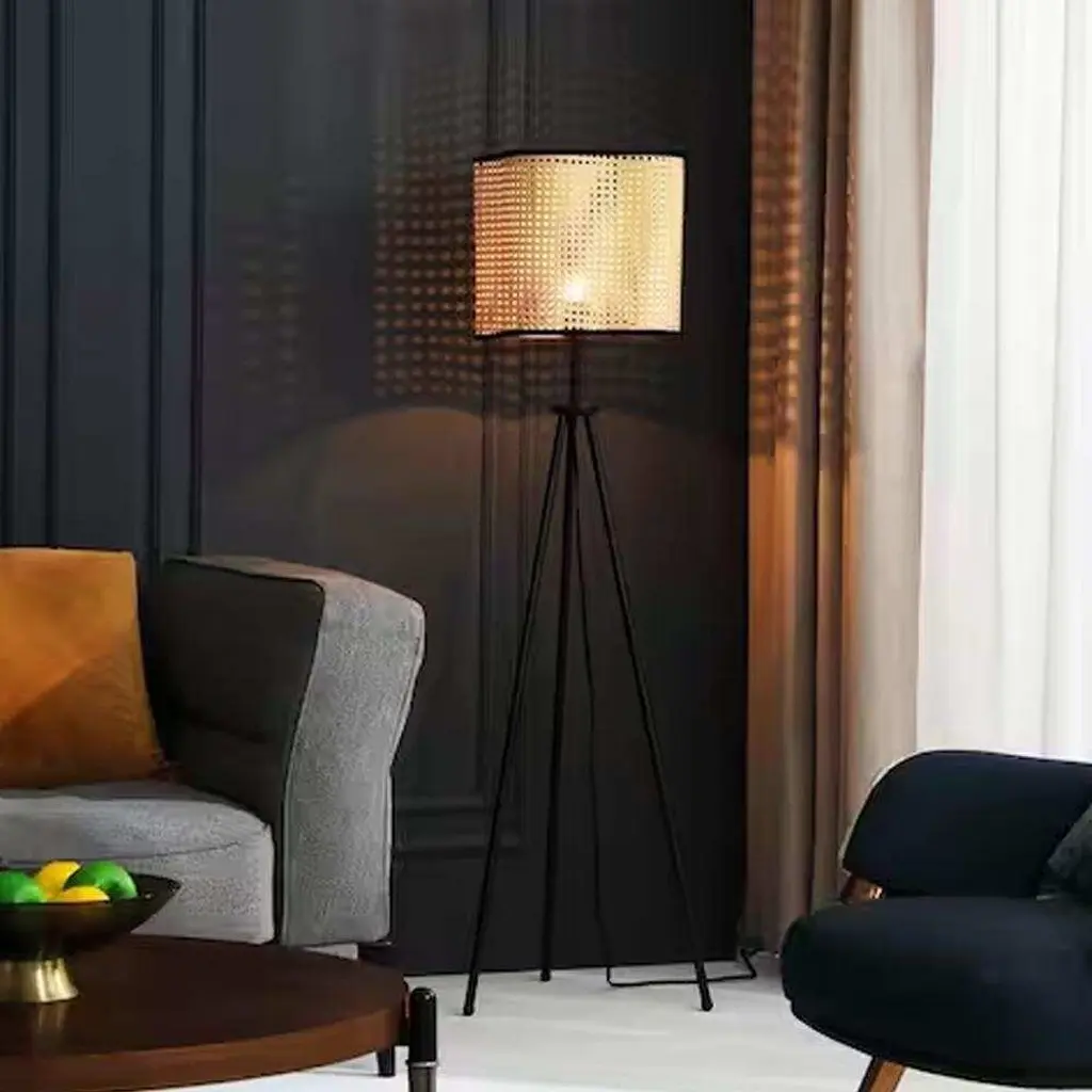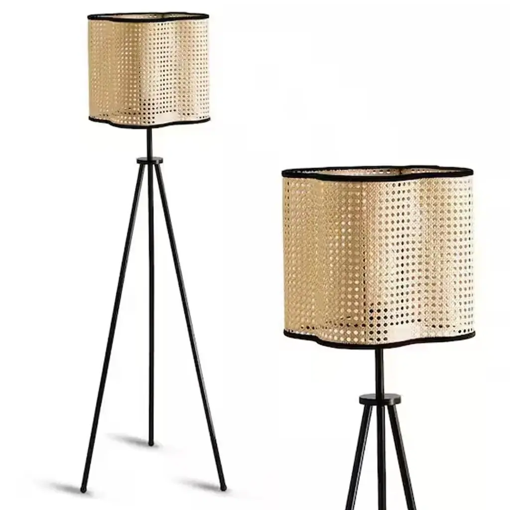 Illuminate your bedroom, living room or home office with this unique rattan and velvet tripod floor lamp. It's specially crafted from durable Rattan-style PVC with velvet stitched around the outer rim and high-quality iron legs. This light fixture is the perfect addition to modern, bohemian, mid century or transitional style homes. For a warm and inviting look, we recommend using a warm colored or vintage style bulb. Bulb not included. Highlights MID century tripod lamp: elevate the look of any bohemian, modern, mid century, transitional, vintage or retro decor, with 3 iron legs and a rattan-style PVC shade with unique velvet accents and curves, you're sure to love this Gal lamp in your bedroom, living room or any other space that needs a little bit of extra flair High quality materials: this floor lamp is crafted from rattan-style PVC, velvet and iron which are not only durable but add to the modern aesthetic of bedrooms, living rooms and home offices, the unique shade makes the light dance across your room Unique curved lampshade: looking for something you haven't seen in your friends' homes. look no further than this special light fixture, it features unique curves in the shade to add interest to any space, velvet is stitched around the outer rim Bulb requriments: this floor lamp utilizes a single E26 bulb with a maximum of 60-Watt we recommend using a warm colored bulb, bulb not included Vidalite guarantee: light up any space without worry, Vidalite has you covered with our 1-year limited warranty guarantee Modern Minimalist