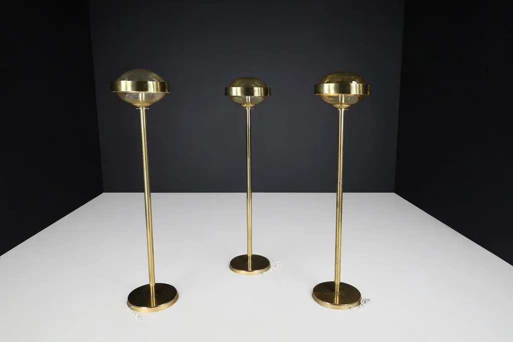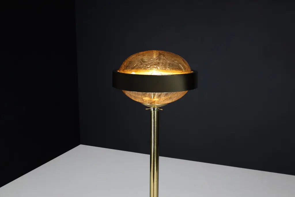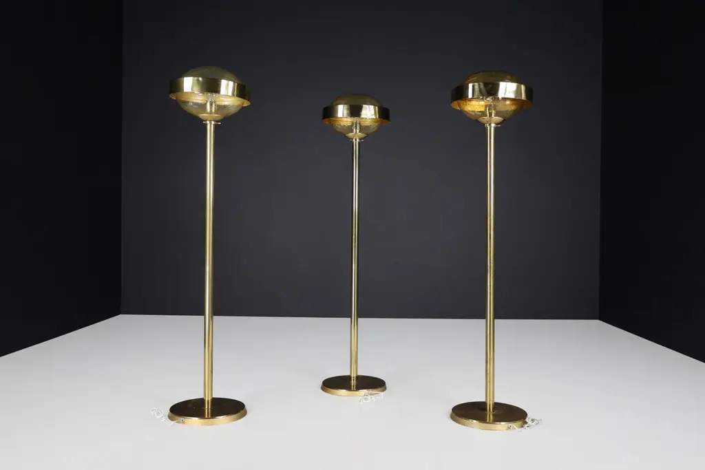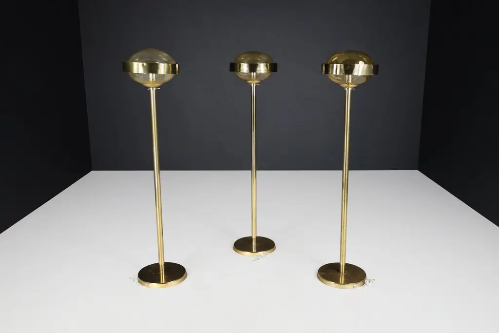 Mid-Century Brass Floor Lamp with Hand-Blown Glass Shade – Prague, 1960s (3 Available, Priced Per Item)This striking mid-century brass floor lamp, created in Prague during the 1960s, exemplifies the refined elegance and craftsmanship of Eastern European modernist design. Featuring a sleek brass structure and a hand-blown amber glass globe, each lamp is a sculptural piece that combines functionality with artistic sophistication.Standing 150 cm tall with a 37 cm diameter shade, the lamp’s proportions are clean and architectural. The slim, polished brass stem rises from a weighted circular base to support a large, dome-shaped glass diffuser. The hand-blown globe is richly textured with organic air bubbles throughout, producing a soft, ambient glow when lit. A brushed brass band encircles the glass at its widest point, adding visual structure and a planetary silhouette reminiscent of the Space Age aesthetic.These lamps have been professionally cleaned and rewired to meet modern electrical standards and are fully compatible with US, UK, EU, and Asian systems. Each is fitted with a standard E27 socket, suitable for both LED and incandescent bulbs. They are ready for immediate installation, making them perfect for residential or hospitality use.With three lamps available and each priced individually, this is an ideal opportunity for interior designers or collectors to acquire a set of matching floor lights with strong visual cohesion. Whether displayed as a trio for dramatic symmetry or used individually, each lamp brings a warm, golden ambiance and a bold, mid-century statement to any space.These pieces capture the spirit of 1960s Prague design—minimalist in form, rich in material, and timeless in appeal.
