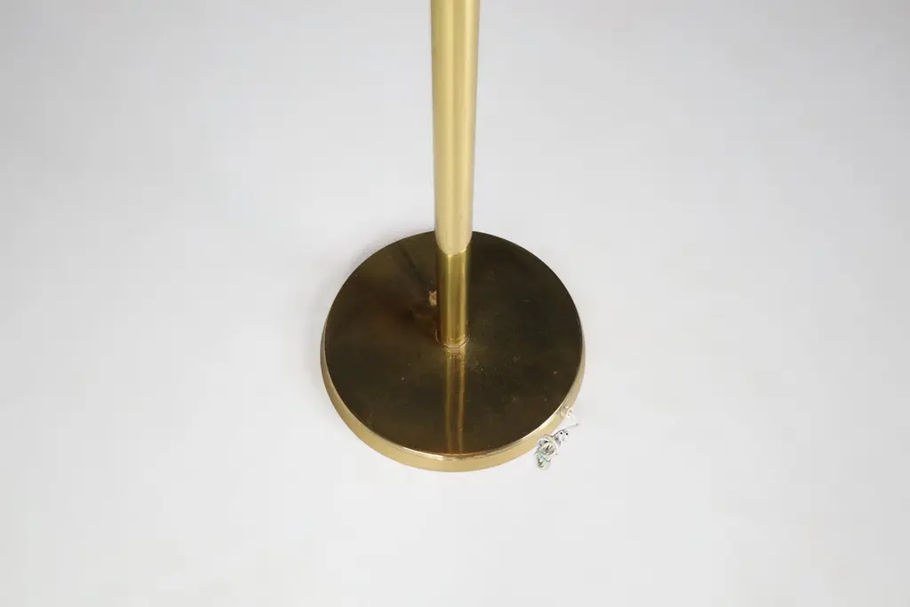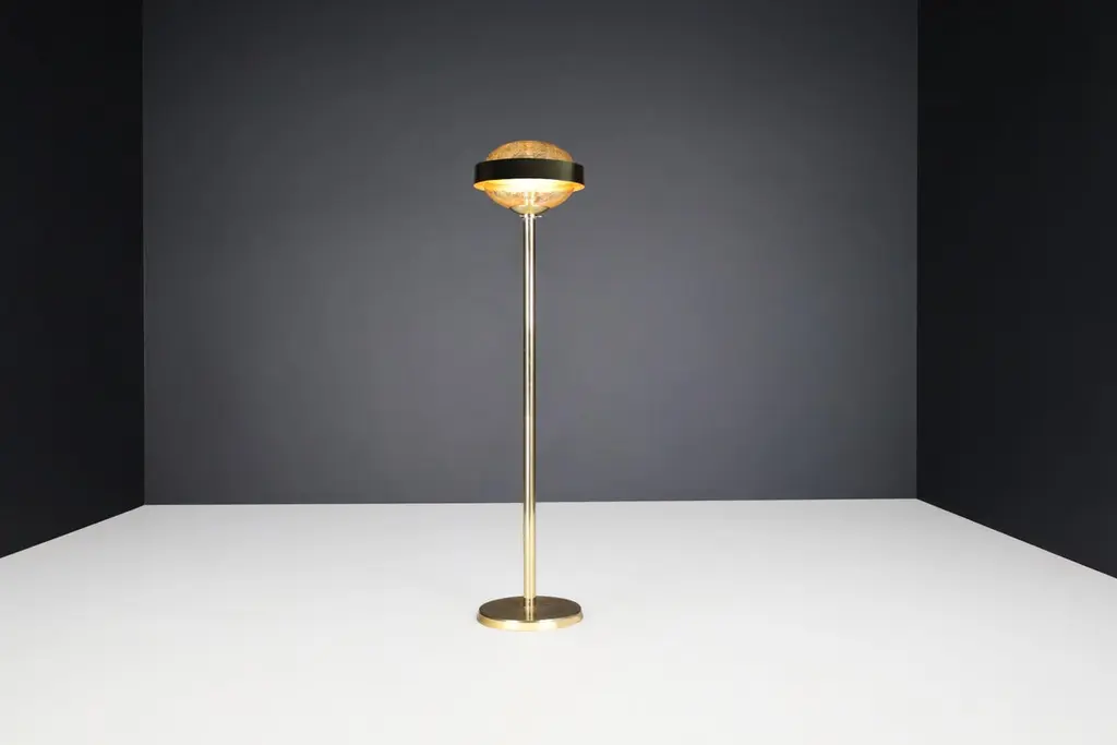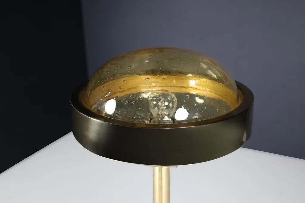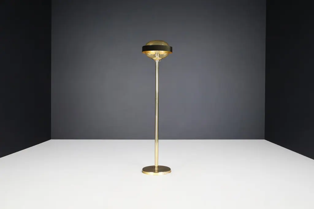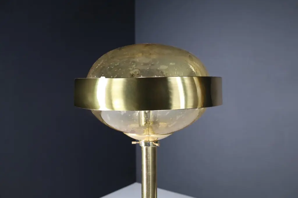 Mid-Century Brass Floor Lamp with Hand-Blown Glass Shade – Prague, 1960s (3 Available, Priced Per Item)This striking mid-century brass floor lamp, created in Prague during the 1960s, exemplifies the refined elegance and craftsmanship of Eastern European modernist design. Featuring a sleek brass structure and a hand-blown amber glass globe, each lamp is a sculptural piece that combines functionality with artistic sophistication.Standing 150 cm tall with a 37 cm diameter shade, the lamp’s proportions are clean and architectural. The slim, polished brass stem rises from a weighted circular base to support a large, dome-shaped glass diffuser. The hand-blown globe is richly textured with organic air bubbles throughout, producing a soft, ambient glow when lit. A brushed brass band encircles the glass at its widest point, adding visual structure and a planetary silhouette reminiscent of the Space Age aesthetic.These lamps have been professionally cleaned and rewired to meet modern electrical standards and are fully compatible with US, UK, EU, and Asian systems. Each is fitted with a standard E27 socket, suitable for both LED and incandescent bulbs. They are ready for immediate installation, making them perfect for residential or hospitality use.With three lamps available and each priced individually, this is an ideal opportunity for interior designers or collectors to acquire a set of matching floor lights with strong visual cohesion. Whether displayed as a trio for dramatic symmetry or used individually, each lamp brings a warm, golden ambiance and a bold, mid-century statement to any space.These pieces capture the spirit of 1960s Prague design—minimalist in form, rich in material, and timeless in appeal.