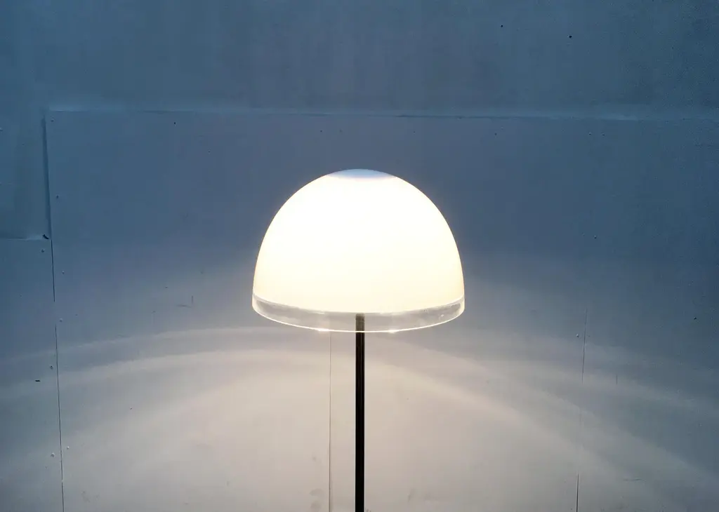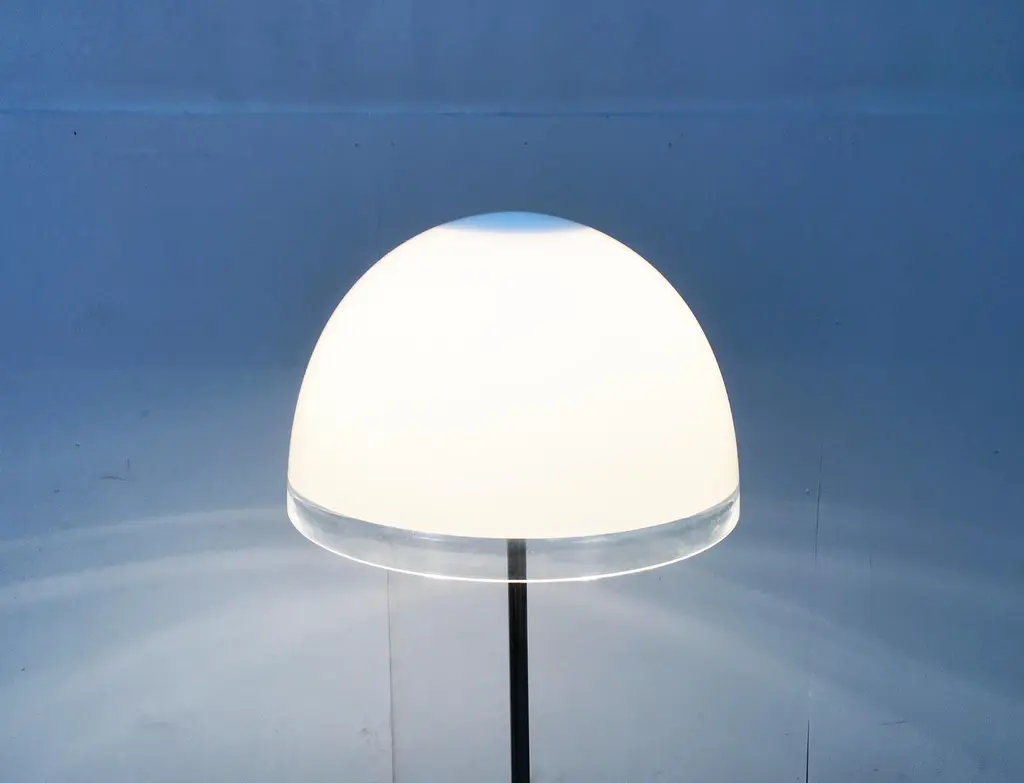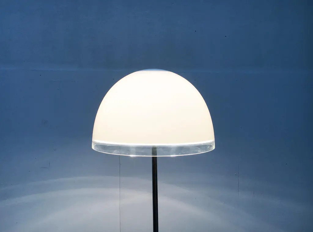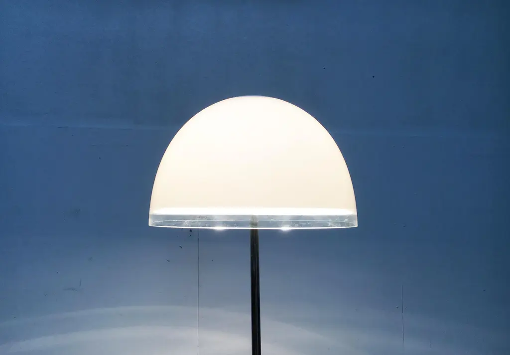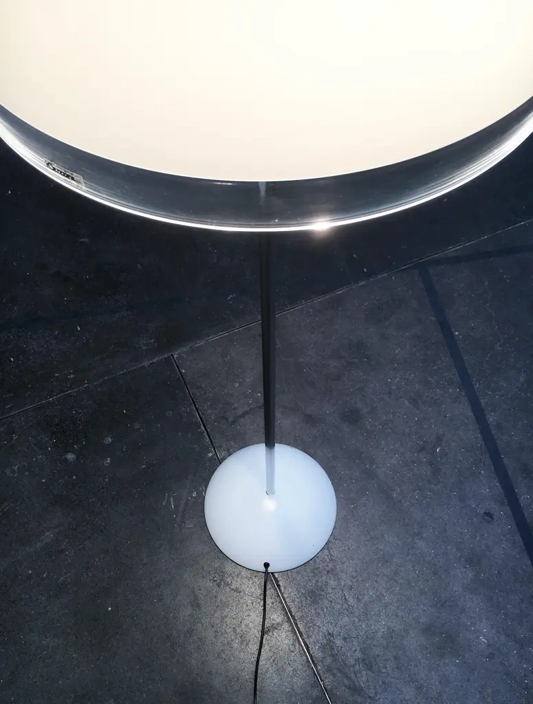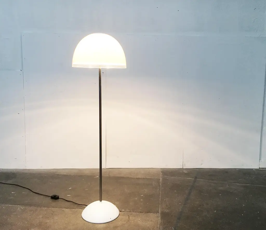 Rare floor lamp by the Italian manufacturer iGuzzini. The mushroom-shaped lampshade is made of translucent acrylic (methacrylate). The bottom is clearly stated and forms a ''brilliant'' conclusion. The thickness of the material is wonderful to read at the edge. The white of the screen is repeated at the bottom of the base of the floor lamp. The heavy foot forms a shallow dome made of a chrome rod protrudes. A particularly detailed form the black lead which visibly emerges from the foot. The Baobab floor lamp was only from 1978-1982 in production. The lamp is in very good condition with signs of use. This piece has an attribution mark, I am sure that it is completely authentic and take full responsibility for any authenticity issues arising from misattribution, European Plug (up to 250V).The wiring of this item may be original and might need replacement, if not specified otherwise.