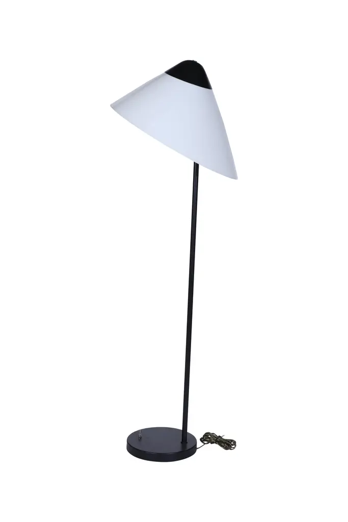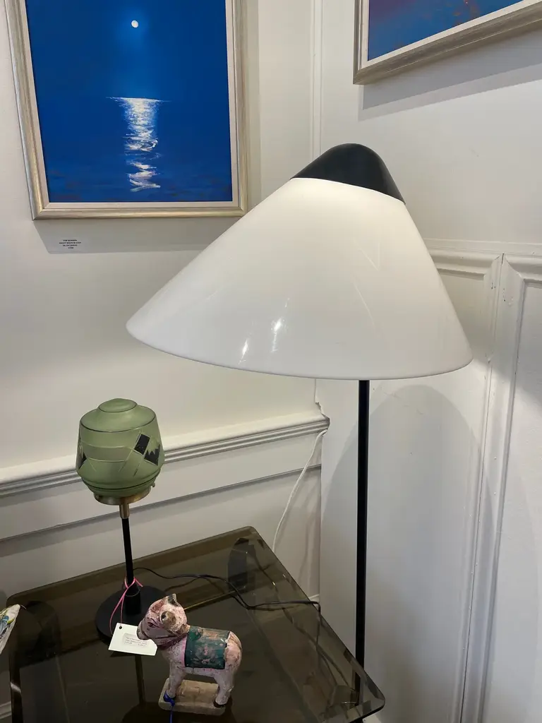A Mid Century Modern floor lamp by Louis Poulsen, a Danish lighting manufacturer. It is an iron base with a large asymmetrical acrylic shade. The base itself measures 10" in diameter. The on/off switch is on the iron base. It has been rewired for American use and takes one standard base light bulb. The Lockhart Collection is a personally curated gallery of antiques and fine jewelry, owned and operated by Deborah Lockhart Phillips. The antiques and vintage pieces encompass Nautical Artifacts & Instruments, Art Deco and Mid-Century Modern Furniture and Lighting, British Campaign furniture, and of course the finds that simply defy being categorized. The Lockhart Collection is a notable and trusted resource for many interior designers and movie production companies. An affinity for the sea, spirit of adventure, a discerning eye and a belief in keeping life interesting, informs her style and therefore the collection. Deborah sources quality, one-of-a-kind and distinguished pieces; found both domestically and abroad and has done so for over 30+ years. Located on Nantucket Island.