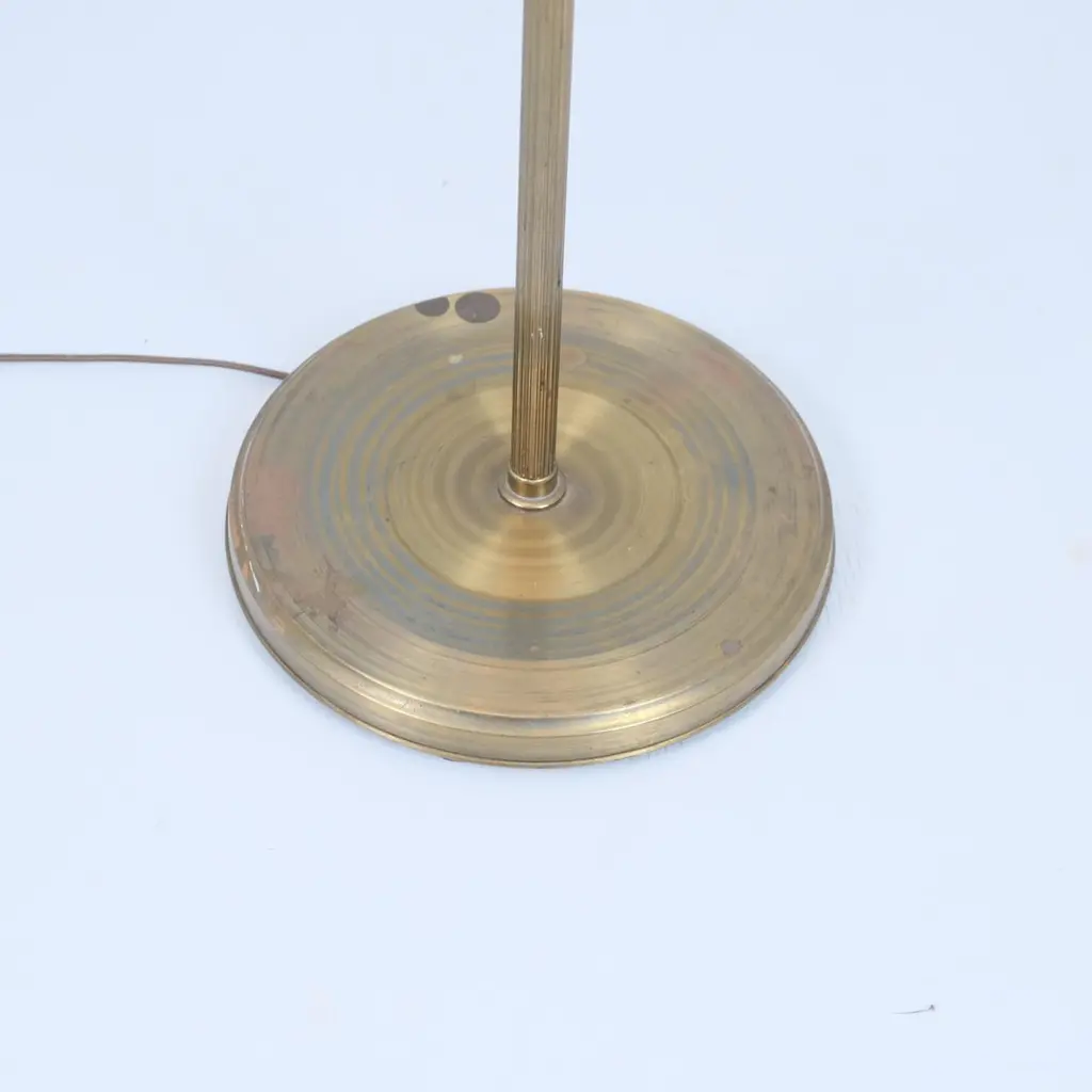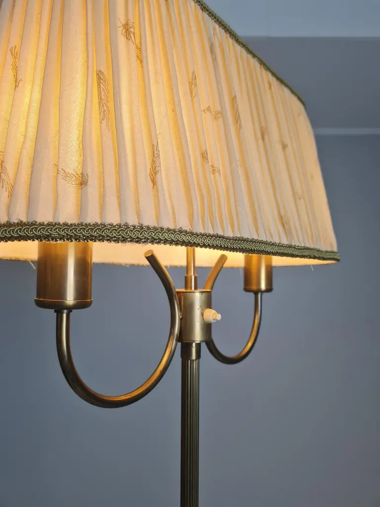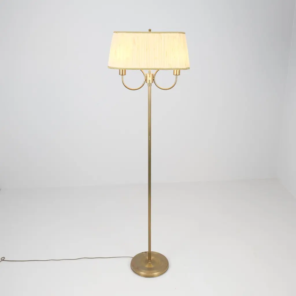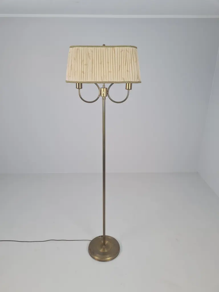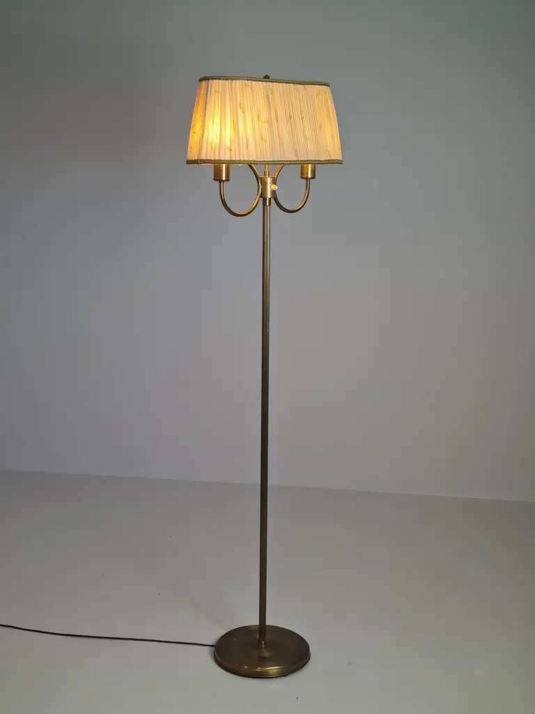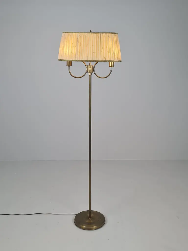 Elegant mid-century floor lamp, most likely of Scandinavian origin, possibly Finnish or Swedish, crafted from brass with a warm, aged patina. The design features a slender, minimalist stem rising from a circular weighted base, leading to two gracefully circularly curved arms that support a softly pleated fabric shade. The shade casts a warm, diffused light, creating an inviting ambiance.This lamp exemplifies the understated sophistication of Scandinavian design from the mid-20th century—balancing clean lines with refined details while in these cases, keeping a classical vibe. Perfect for adding a timeless touch to living rooms, reading corners, or interiors with mid-century, neoclassical, or eclectic influences.