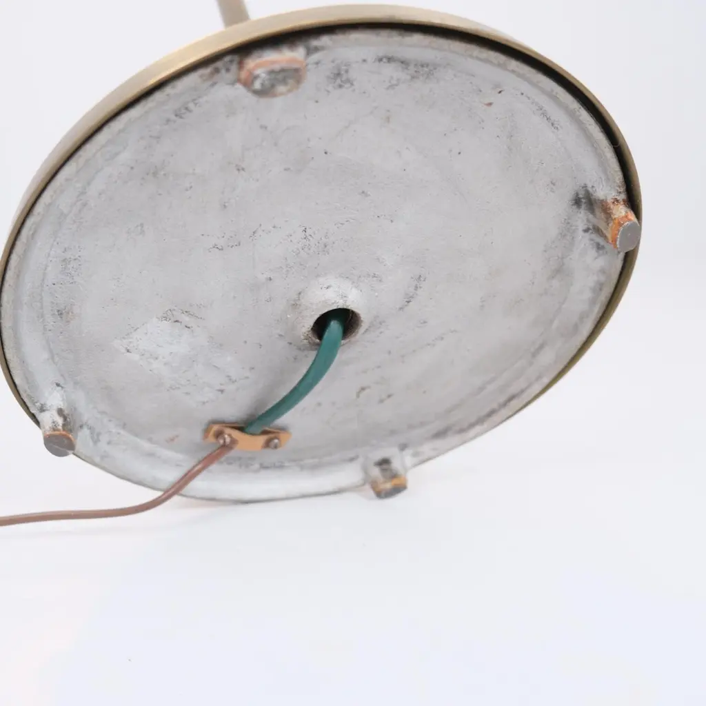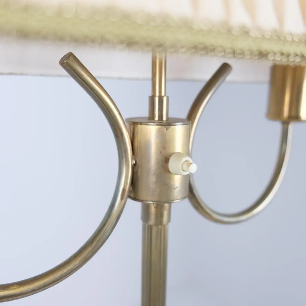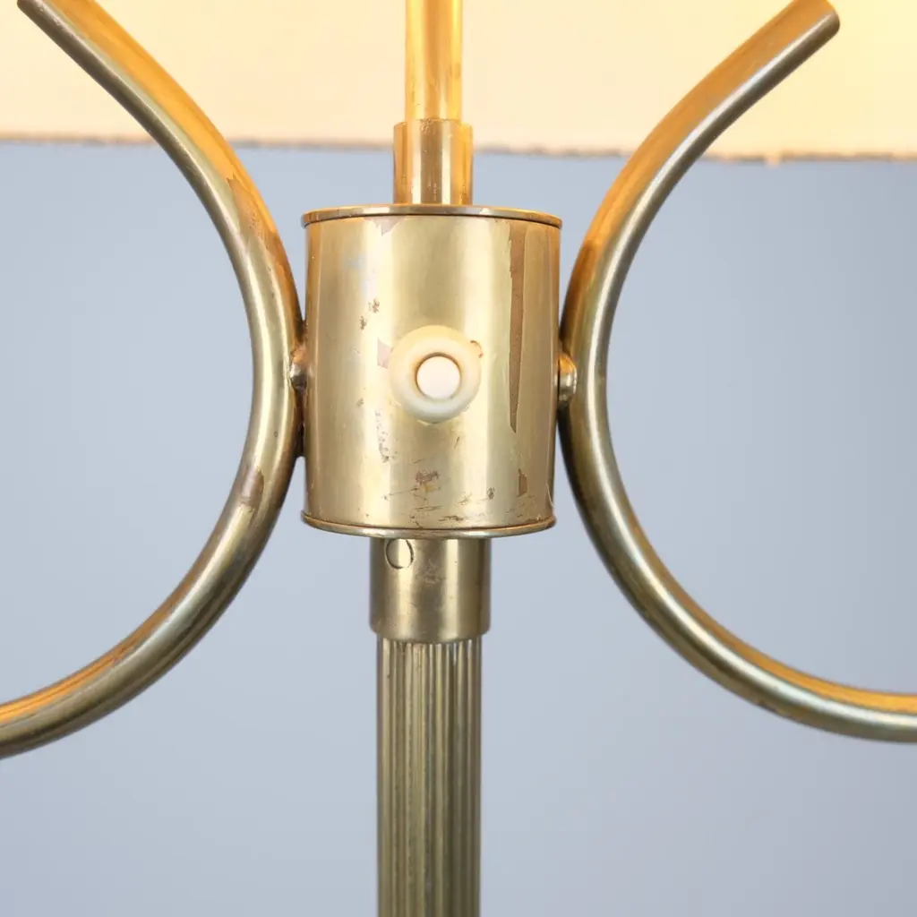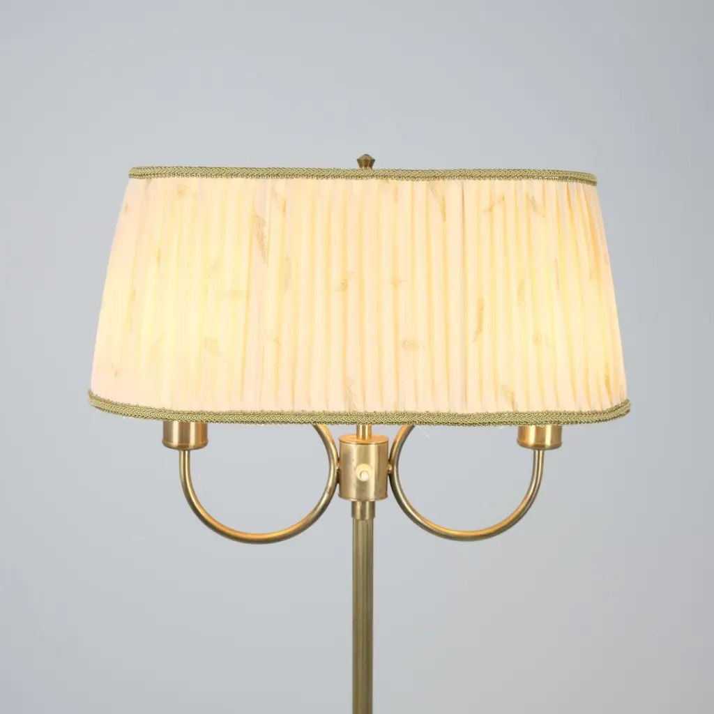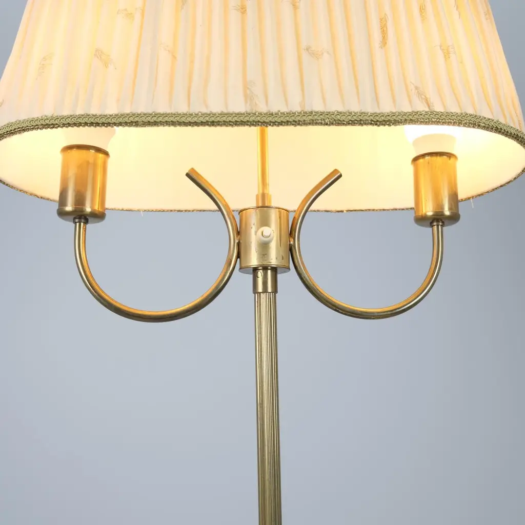 Elegant mid-century floor lamp, most likely of Scandinavian origin, possibly Finnish or Swedish, crafted from brass with a warm, aged patina. The design features a slender, minimalist stem rising from a circular weighted base, leading to two gracefully circularly curved arms that support a softly pleated fabric shade. The shade casts a warm, diffused light, creating an inviting ambiance.This lamp exemplifies the understated sophistication of Scandinavian design from the mid-20th century—balancing clean lines with refined details while in these cases, keeping a classical vibe. Perfect for adding a timeless touch to living rooms, reading corners, or interiors with mid-century, neoclassical, or eclectic influences.