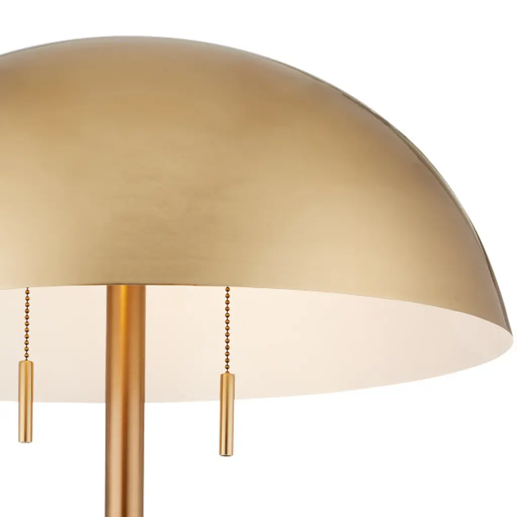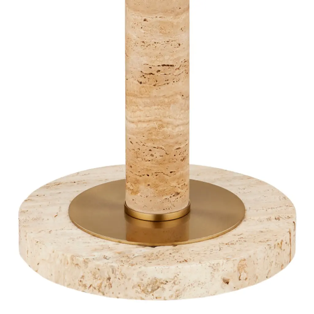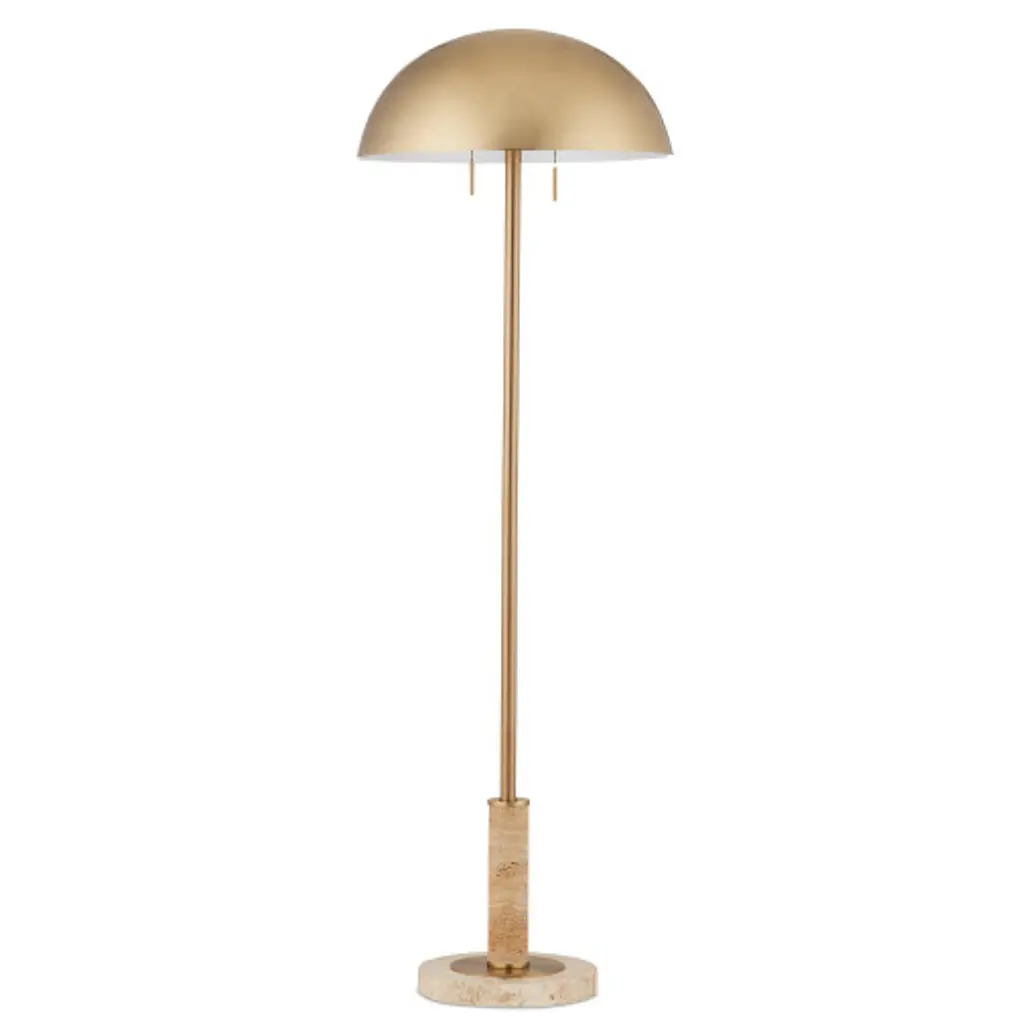 Aimee Kurzner designed the Miles Floor Lamp; the travertine lamp inspired by other pieces with the same name. The mid-century modern vibe is enhanced by the simple shapes of the lamp's base and body, and the domed brass shade that caps it. Because this lamp is made of natural stone, texture and color may vary from lamp to lamp.