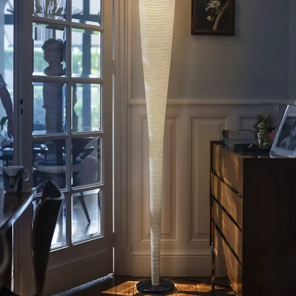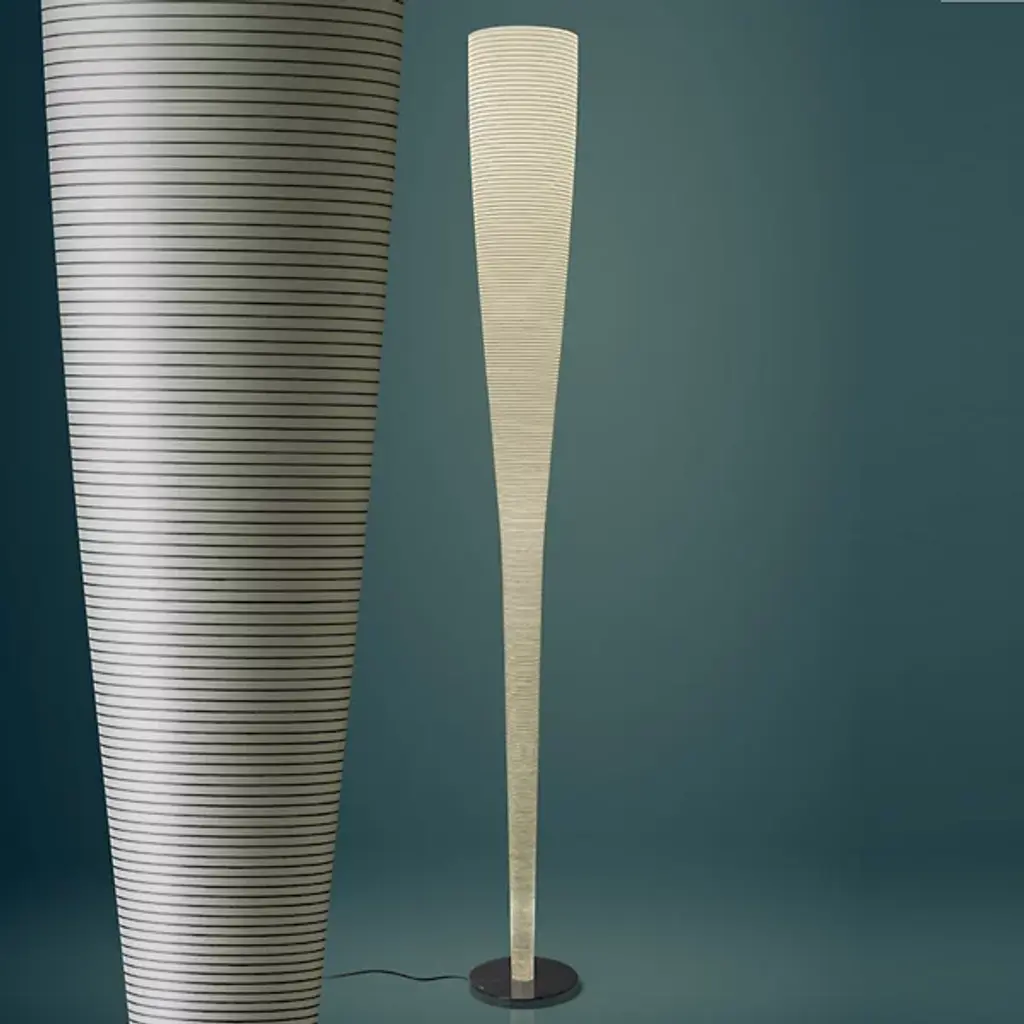The Mite Anniversary LED Floor Lamp by Foscarini brings an update to the cool, captivating look of the original Mite Lamp, pairing it with a beautiful marble base and much thinner carbon threads throughout its form. Created by industrial designer Marc Sadler, the Mite lamp was born while thinking about a project that would have the sense of uncertainty found in glass while allowing each piece to maintain its own personality. Sparked while watching tennis racket production in Taiwan, Sadler was more impressed with the raw form of the rackets versus the finished, painted version that covered what he thought was a piece that captured and filtered light beautifully. An experimental approach to production gave this lamp its cool shape, mimicking the way stalagmites grow from the ground up, creating a dynamic space for light to play.