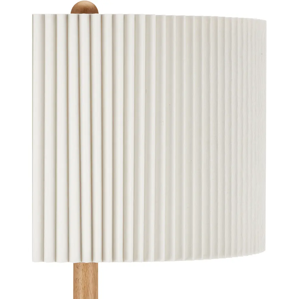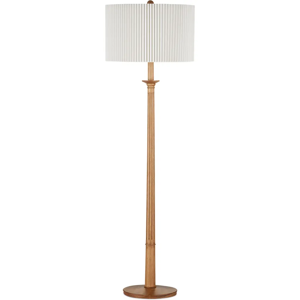 Made from turned wood, the Mitford Floor Lamp has a classic profile that was inspired by a traditional column design. Tom Caldwell envisioned the tan floor lamp with its refined Italian feel. By topping the thin floor lamp with a knife-pleated bone linen shade, he echoed the delineations in the wood lamp's body and made a wonderfully textural accent piece for an interior.