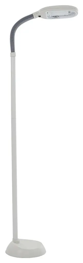 Natural Full Spectrum Sunlight Therapy Reading Floor Lamp that produces pure bright white illumination making colors appear more vibrant while reducing eye strain and fatigue. The supplied 27-Watt CFL Bulb gives as much light as an ordinary 150-Watt bulb, but uses far less energy. This bulb can last up to 5,000 hours, 5x longer than other bulbs. The flexible goose-neck design lets you adjust the lamp to any angle to direct light where you need it. Perfect for reading, working, or doing intricate craft work. A must-have addition to your home or office, this lamp provides natural full spectrum daylight hues, brightening even rooms that have minimal sun exposure.- Superior & natural lighting; Made with modern lighting technology- Lights up a room over 350 sq. ft.; Flexible goose neck adjusts to any task or hobby- 27-Watt bulb - a much light as an ordinary 150-Watt bulb- 5000 hours per bulb; Color temperature: 6500K; 1300 lumens- Dimensions: 10 W x 9 D x 55 H Inches; Cord length: 55 in.- Lamp Base Material: Plastic; Fixture & Base Color/Finish- Light Bulb Type Included: Fluorescent; Primary Switch Type: On/off