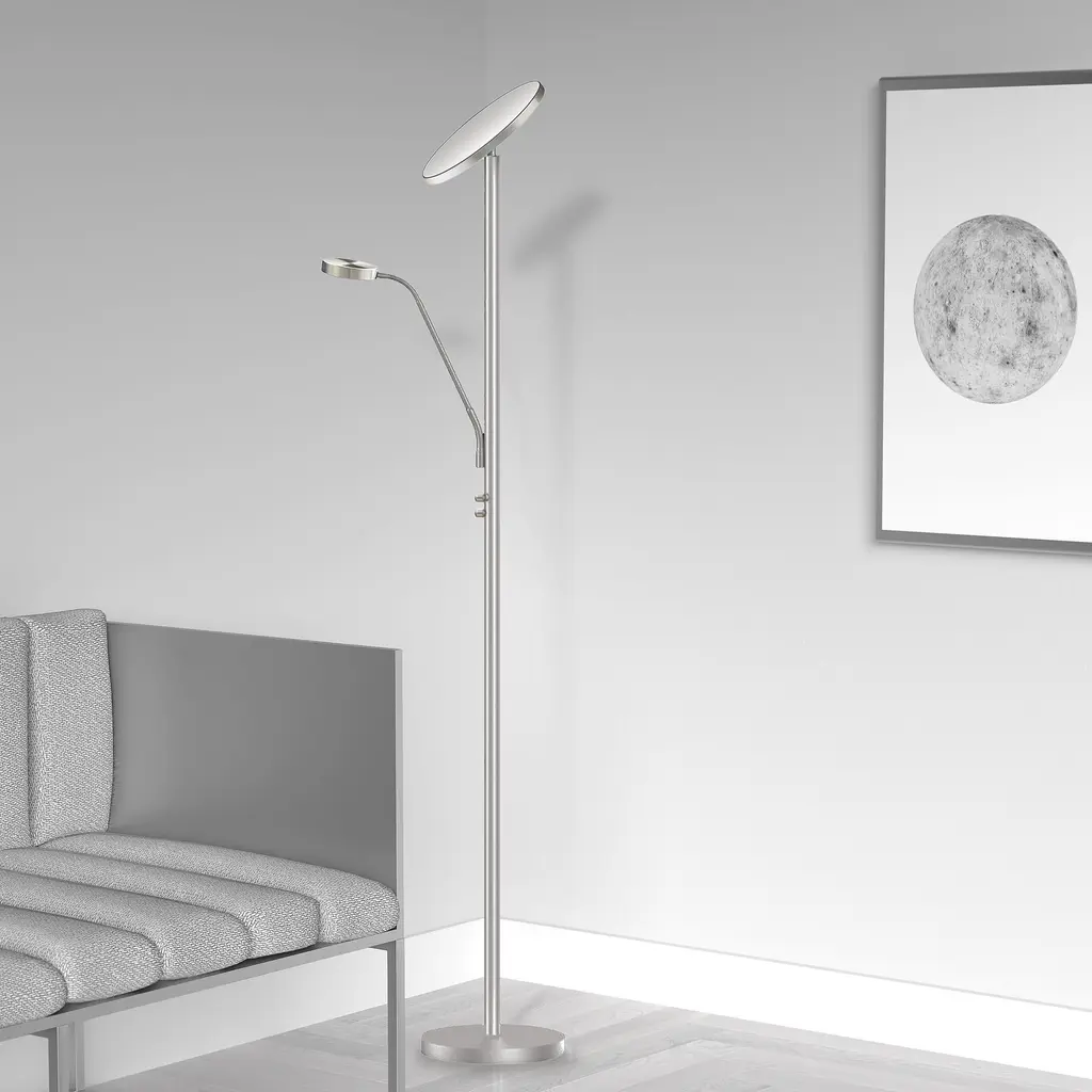 Adding welcome light in a smooth contemporary aesthetic, the LED Floor Lamp collection features a distinctive profile. The design features an integrated LED light. LED fixtures produce light at up to 90 percent better efficiency than incandescent lighting. The metal base and rod curves back slightly for the simple configuration, splitting into two arms for the mother/son light. The light housing directs illumination down from above, making it ideal for reading, studying or work. Available in both a simple and mother/son configuration, it's a stylish and practical solution to any dark corners of your home or office.