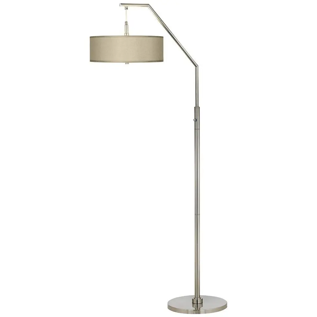 PRODUCT DETAILS: 71 1/2" high overall. Drum shade is 16" wide x 5 1/2" high. Uses two maximum 100 watt standard-medium base light bulbs (not included). 4-position stem column switch. Switch positions: Right bulb on, left bulb on, both on, both off. Brushed nickel finish lamp base and top arm. Metal construction. From the Possini Euro Design brand. Hand assembled sesame beige textured faux silk shade, with an acrylic diffuser at the bottom. Polyester fabric shade. 8-foot long cord. DESCRIPTION: This contemporary floor lamp comes from the Possini Euro Design®. brand and offers a designer look and practical design. The Sesame beige faux silk shade is hand-assembled by artisans in our California workshops, and features a plastic diffuser at the bottom to prevent glare. The base comes in a sleek, brushed nickel finish.
