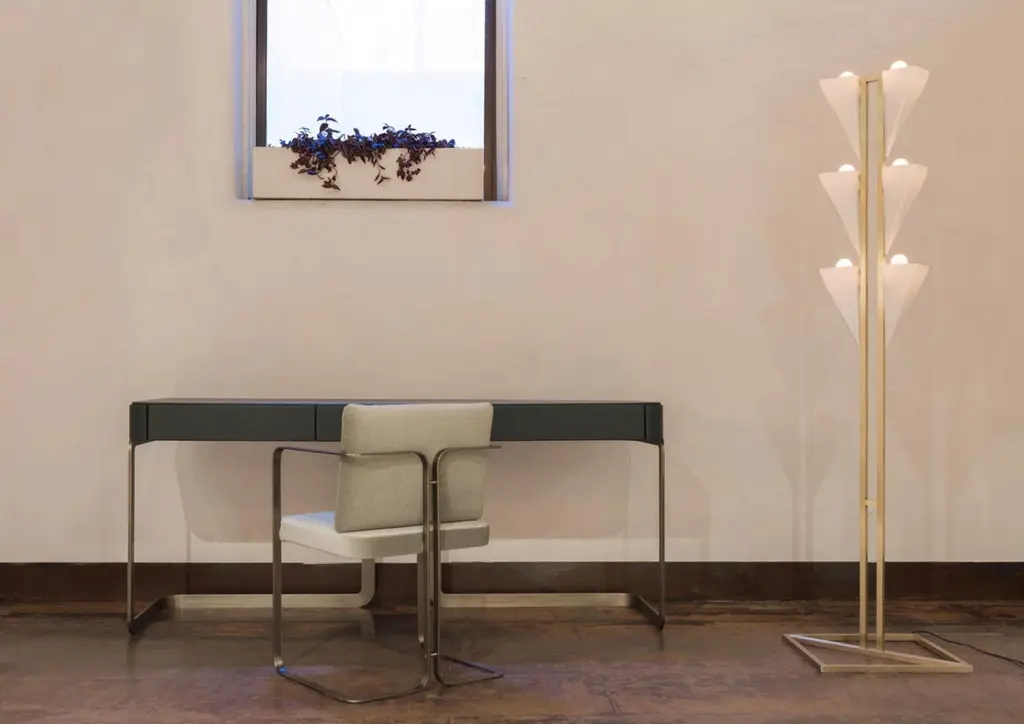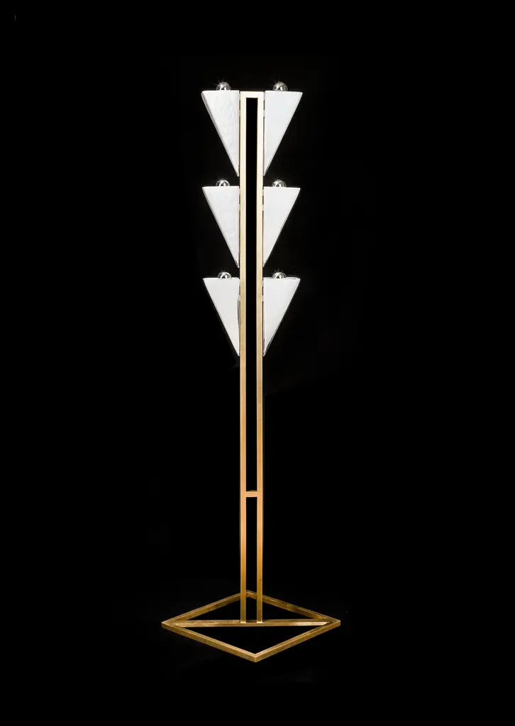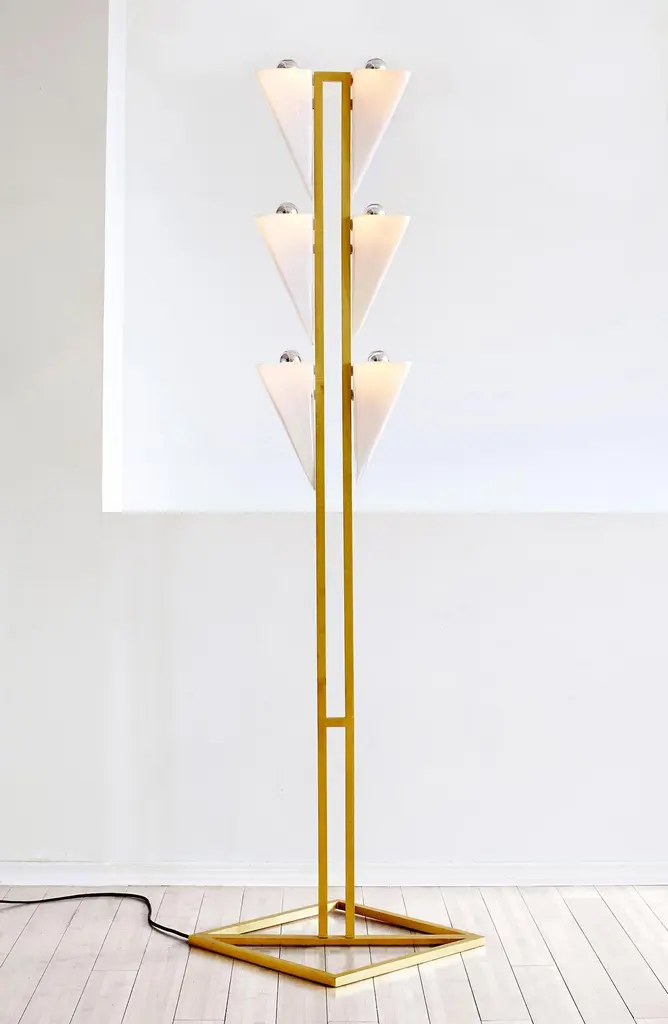 Drawing inspiration from infinite patterns, the Cyrus floor lamp is part of Bianco Light and Space, Tessellation series, a sculptural investigation using light, symmetry, and modular tessellation as concepts for building forms.The Cyrus floor lamp is composed of six hand blown glass modules shown in enamel white with linear brushed brass base and bespoke hardware exuding an elemental simplicity and providing a beautiful directional glow.
