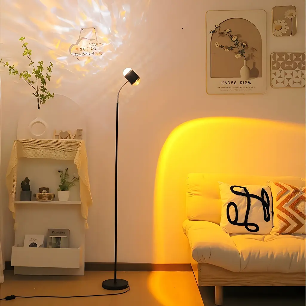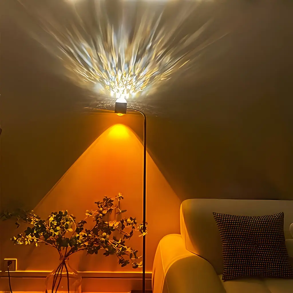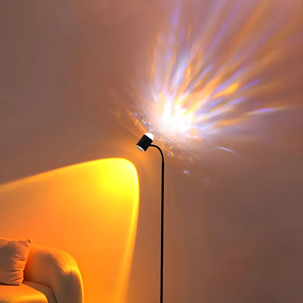 Transform any room into a serene seaside or a romantic sunset with this double-sided lighting floor lamp. With dual ocean wave and sunset heads, adjustable angles, and customizable colors, you can craft the perfect ambiance for any occasion. This stunning DualHead Floor Lamp is here to bring you a stunning blend ofartislry and functionality, designed to captivate your senses and elevate yoursurroundings. One of the most remarkable features is its dual-head design.With one head, you can immerse yourself in the warm, soothing embrace of abreathtaking sunset, or bask in the vibrant hues of an evening glow. The otherhead brings to life dynamic, ever-moving water ripples that create an aura oftranquility and serenity. Choose between these two mesmerizing modes to suityour mood and create the perfect ambiance for any occasion.Features: