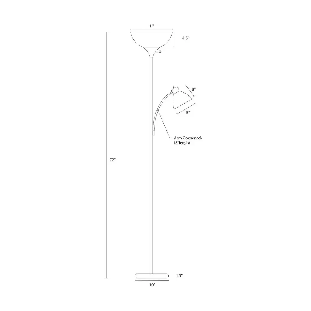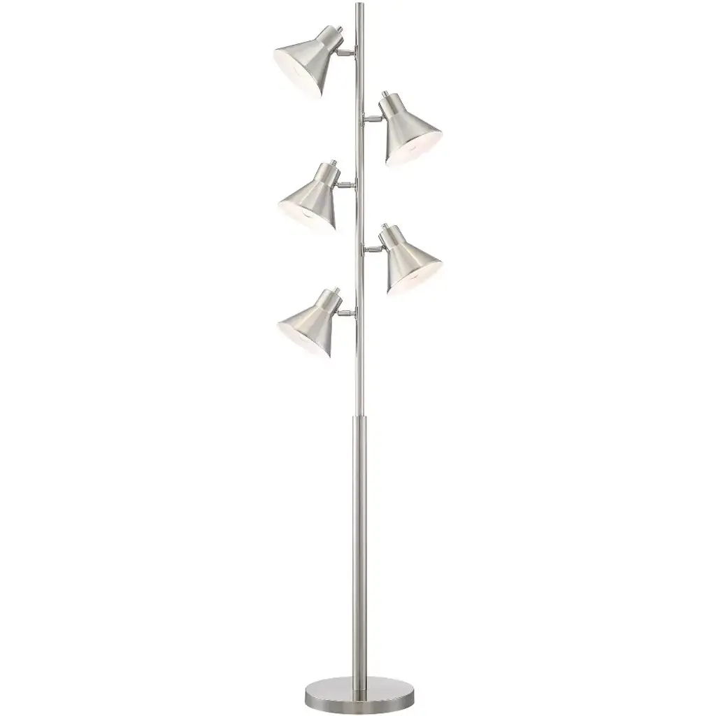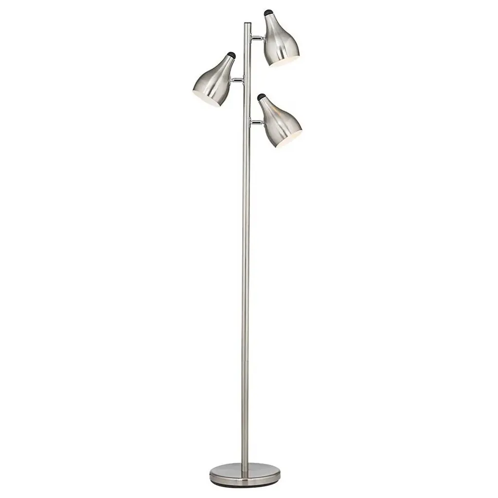 PRODUCT DETAILS: 64" high overall. Round base is 10" wide. Weighs 16.7 lbs. Uses three maximum 40 watt standard-medium base bulbs (not included). On-off buttons on each light. Trac tree-style floor lamp with 3 adjustable lights. A modern look from the 360 Lighting brand. Adjustable lamp heads for reading or other tasks. Aim the lights just where you need it. Brushed steel finish. Metal construction. 8-foot long cord. DESCRIPTION: Add modern task lighting to seating areas, bedrooms and more with the Trac Tree floor lamp from 360 Lighting. Each of the three so-called tree-style lights swivels 360 degrees so you can aim the light where you wish. Each light is individually controlled by an on/off switch at the back of the shade. A stylish and functional addition to your home or office.