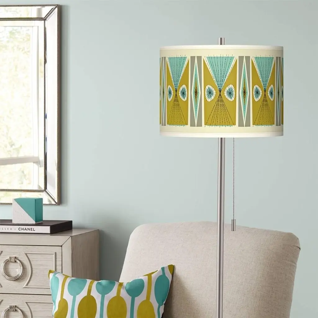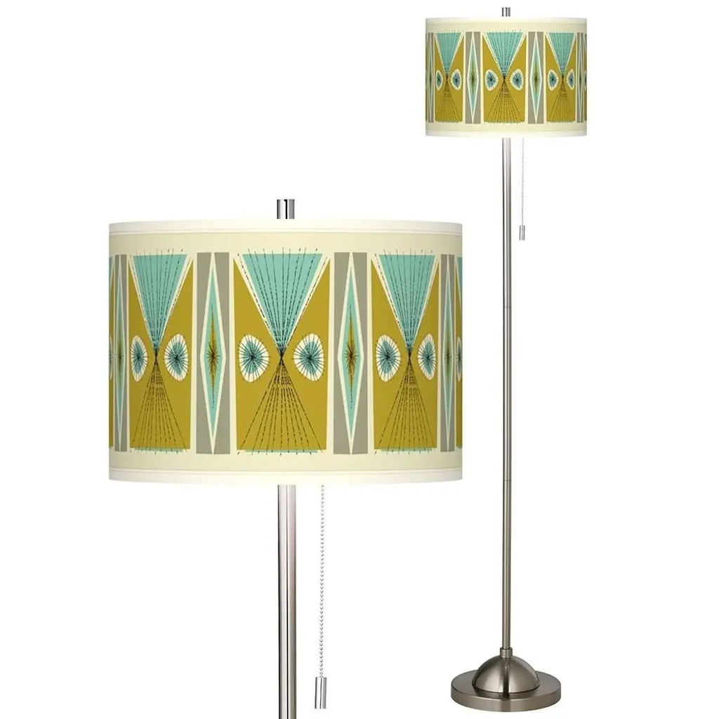 PRODUCT DETAILS: Overall: 62" high. Shade is 13 1/2" wide x 10" high. Base is 10" wide x 1 1/4" high. Takes one maximum 100 watt bulb (not included). Floor lamp with pull chain. Custom printed translucent shade with Vernaculis III pattern. Brushed nickel finish. Design by artist Ragnar. DESCRIPTION: The base of this floor lamp has a modern look that pairs well with the unique personality of a giclee art shade. The custom shade features an exclusive Vernaculis III pattern designed by retro modern pop artist and illustrator Ragnar, and is printed by the same technique used in reproducing museum-quality artwork. The base features a cool, brushed nickel finish and has an on/off pull chain.