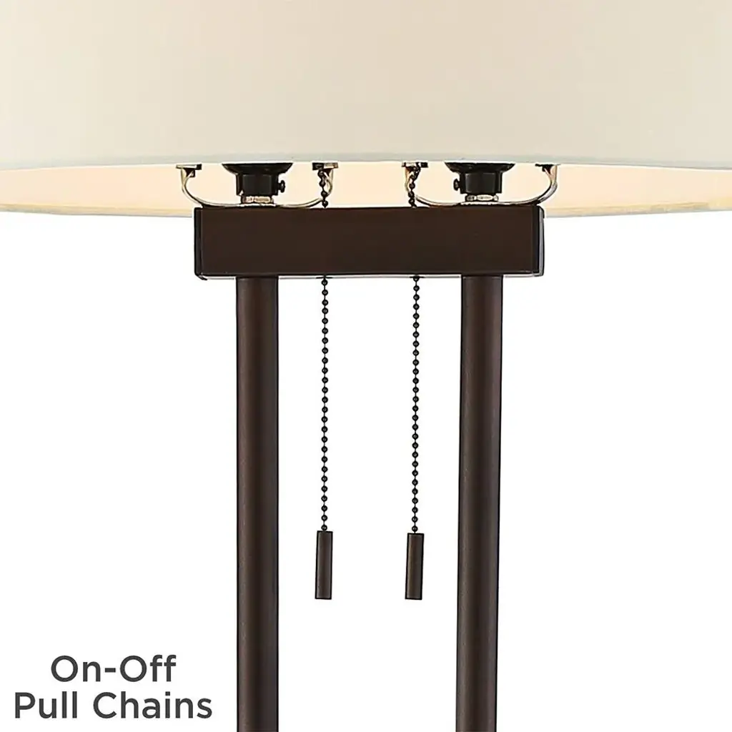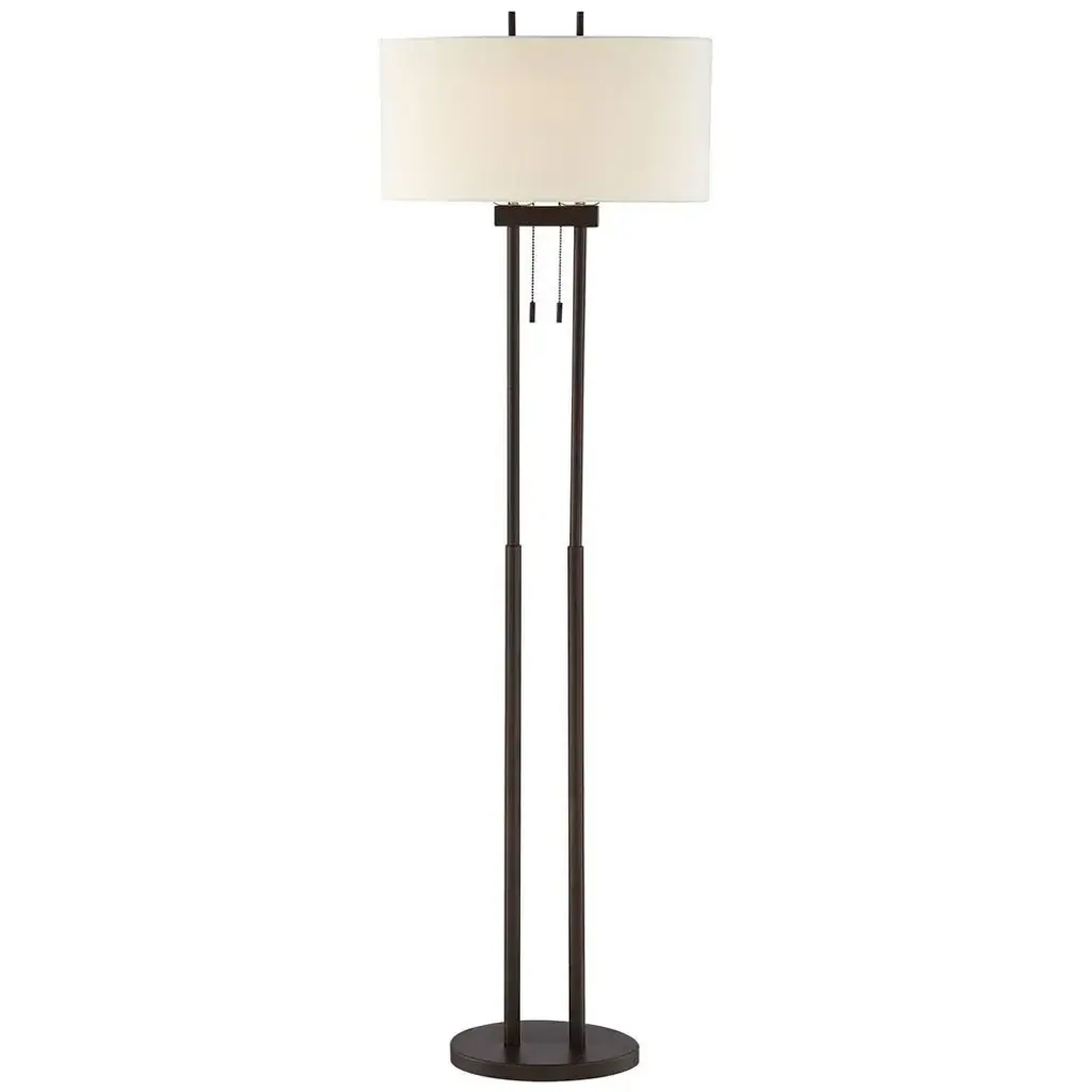 PRODUCT DETAILS: 62" high overall. Oval base is 11 3/4" wide x 8 1/2" deep x 1 3/4" high. Oval shade is 19" wide x 12" deep x 9" high. Weighs 11 lbs. Uses two maximum 60 watt standard-medium base bulbs (not included). Two on-off pull chains independently operate each bulb for easy lighting control. Twin pole floor lamp from the Franklin Iron Works brand. Open, modern design. Roman bronze finish. Metal construction oval base, columns, and accents. Oval-shaped shade is in an off-white fabric with a hardback inner liner. 6-foot long black cord. DESCRIPTION: The bronze finish and low-profile design of this floor lamp allow an easy transition into many different types of decor. Slender twin poles extend upward to create a compelling updated design. Control your level of illumination with the dual pull chains.