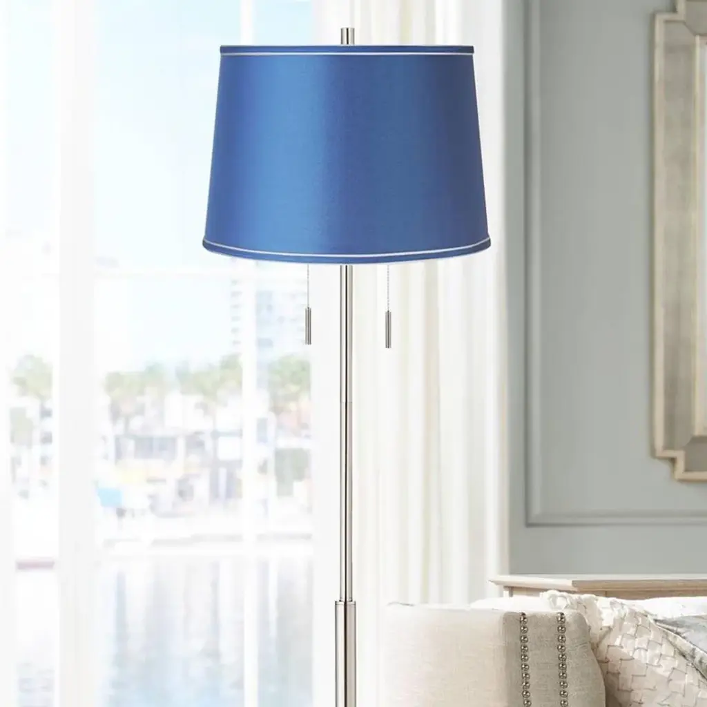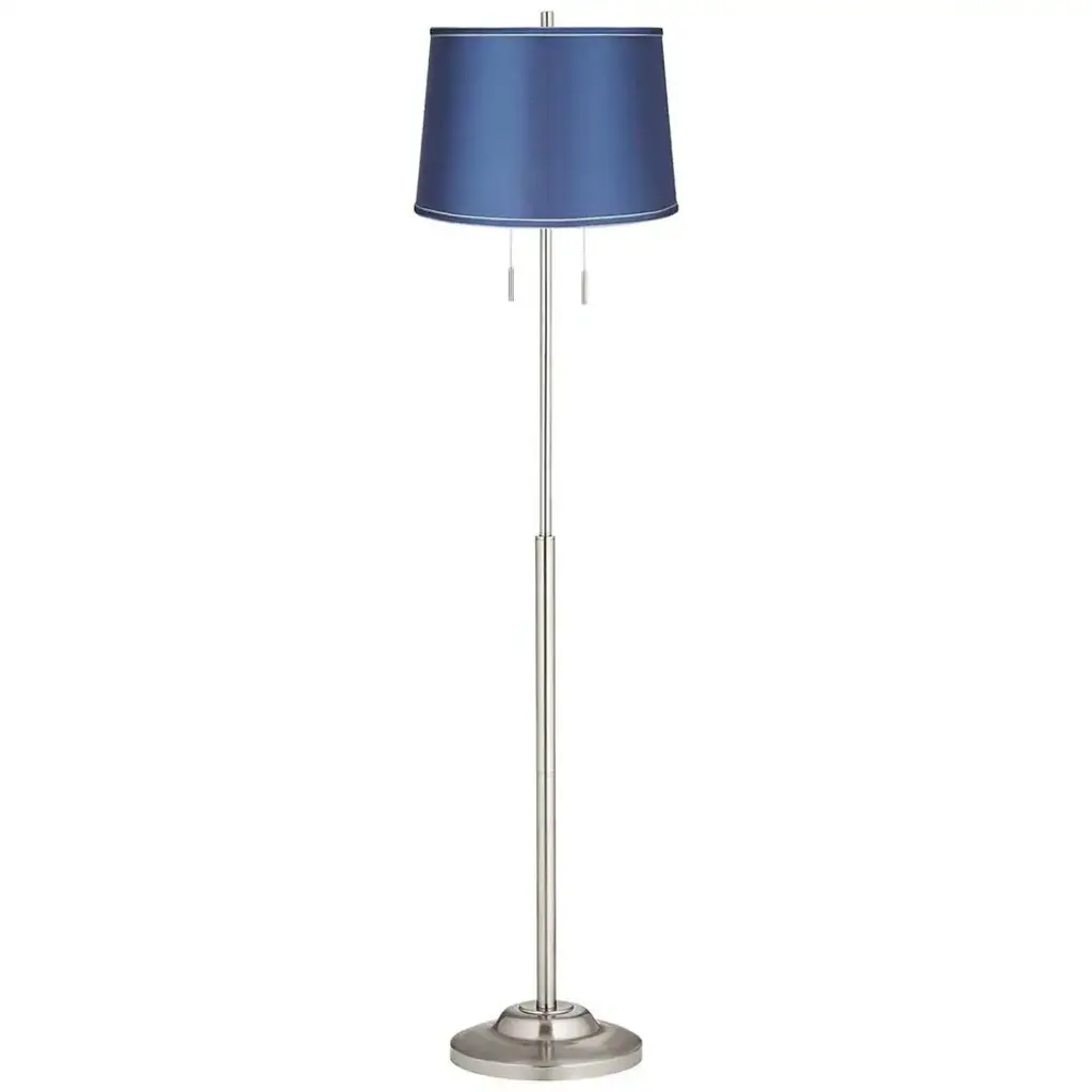 PRODUCT DETAILS: 66" high. Base is 12" wide. Shade is 14" across the top x 16" across the bottom x 11" high. Uses two maximum 75 watt standard-medium base bulbs (not included). Twin on-off pull chains. Pull chain floor lamp from the 360 Lighting brand. Brushed nickel finish base and pole. Metal construction. Medium blue satin fabric drum shade. 8-foot long cord. DESCRIPTION: Update your living space with the help of this brushed nickel finish floor lamp. The design is crafted from metal, and has a chic contemporary look that's paired with a beautiful medium blue satin drum shade. It comes with twin pull chains that rev up the style factor and make it easy to control the light output.