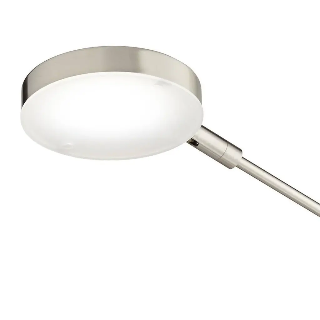PRODUCT DETAILS: Adjustable from 30"-50" high. Light head is 4 1/4" wide x 3/4" high. Base is 9" wide x 1" high. Weighs 8.1 lbs. Built-in 6 watt LED module, comparable to a 45 watt incandescent. 550 lumens. 3000K color temperature. 80 CRI. On-off switch on the pole. Contemporary modern LED floor lamp from the 360 Lighting brand. Energy efficient design. Adjustable arm segments and lamp head allow you to easily adjust the height and light position for reading and other tasks. Satin nickel finish. Aluminum construction. White acrylic diffuser. 6-foot long cord. DESCRIPTION: From 360 Lighting, this energy-efficient LED floor lamp is designed for task lighting purposes. It comes in a sleek metal frame made of thin rods and a round base and head, all dressed in a silvery satin nickel finish. Adjust the height or change the direction of the lighting with the movable joints. Perfect for a reading space or sitting area.