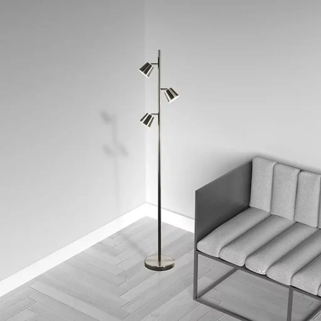 Introduce a tall and proud modern lighting solution to your home with the Modern LED Floor Lamp from Dainolite. Made of smooth metal, this piece starts with a slim rounded plate that acts as a sturdy base for the lengthy and thin rod it mounts. A set of shades rest upon this rod, each at the end of brief arms. Pointing in various directions, the light from the integrated LEDs within the shades presents a bright and full glow in the space, decorating your favorite objects with ease.