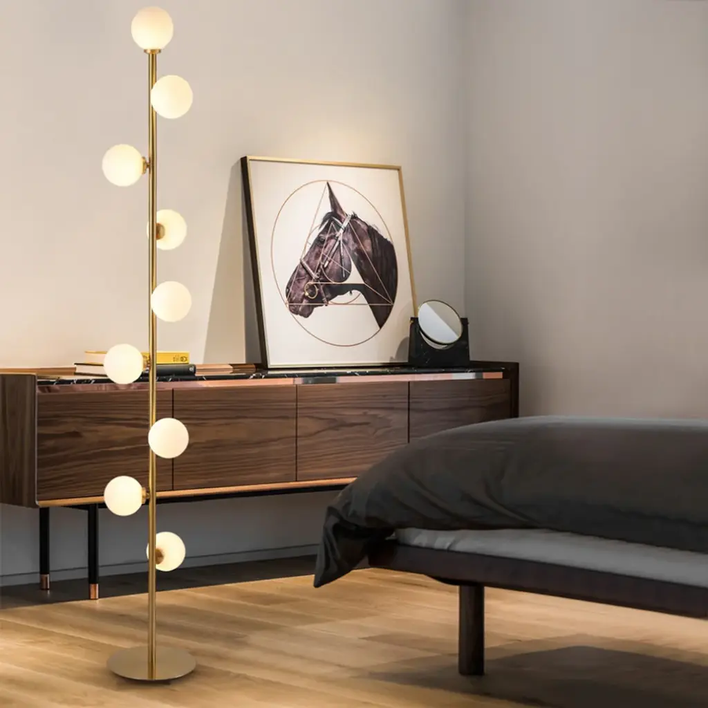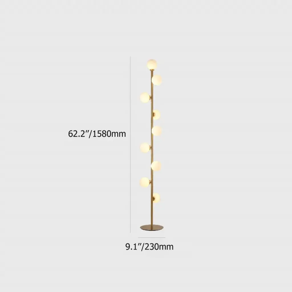 Offering a boost of brightness and a splash of contemporary style, this floor lamp is perfect for breathing new life into any layout. This tree floor lamp is founded atop a metal base that lets you easily tuck it into narrow nooks and unused corners. A solid finish outfits the slender metal body for a minimalist touch. Up above, spherical shades are designed for a modern look. - Diameter of Light Fixture: 9.1" (230mm)- Assembly Instructions: This fixture only need to be plugged in directly and with on/off switch on cable. Minimal assembly is required.Width/Diameter: 9.1"Height: 62.2"Style: ModernLight Source: G9Material: Metal;GlassWatts Per Bulb: 3WReturnable: 30-DayFinish: Gold / Polished BrassNumber Of Lights: 9-LightShade Color: WhiteNumber Of Bulbs: 9Bulb Base: G9Lamp Holder Colour: BrassBulb Included: YesHardwired Or Plug-In: Plug-inSwitch Type: FootAssembly Required: PartiallyWarranty: 1 Year LimitedDimmable: NoColor Temperature Type: Warm White