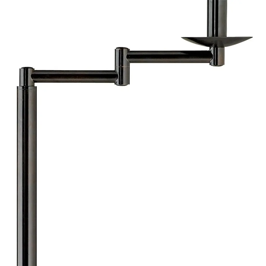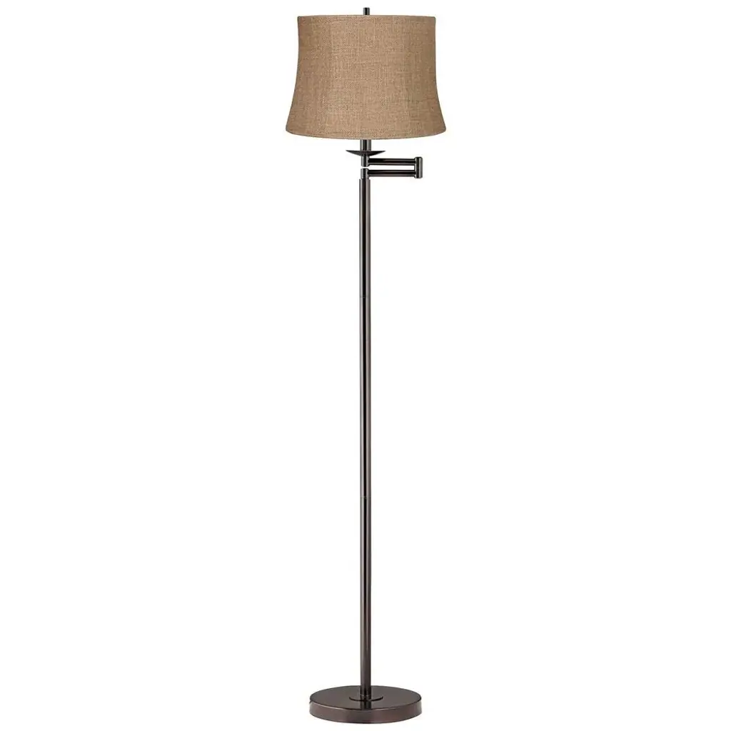 PRODUCT DETAILS: 60 1/2" high overall. Base is 10" wide. Shade is 12" across the top x 14" across the bottom x 10" high. Uses one maximum 100 watt standard-medium base light bulb (not included). On-off socket switch. Swing arm floor lamp from the 360 Lighting brand. Top arm adjusts the light's position as needed. Bronze finish base. Metal construction. Natural burlap fabric drum shade. 8-foot long cord. DESCRIPTION: Perfect next to a sofa or arm chair, this swing arm floor lamp adjusts to position light just where you need it. The design comes in a classic bronze finish with a swing arm at the top and an on/off socket switch. Its topped with an elegant natural burlap fabric drum shade for added style. A 360 Lighting design.
