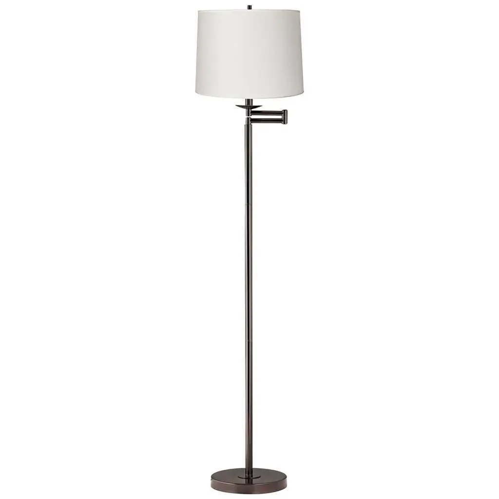 PRODUCT DETAILS: 60 1/2" high overall. Base is 10" wide. Shade is 13" across the top x 14" across the bottom x 10" high. Uses one maximum 100 watt standard-medium base light bulb (not included). On-off socket switch. Swing arm floor lamp from the 360 Lighting brand. Move the swing arm to put the top light in the perfect spot for reading and other tasks. Bronze finish lamp base and arm. Metal construction. White fabric lamp shade with a hardback liner. Tapered drum profile. 8-foot long cord. DESCRIPTION: Perfect next to a sofa or arm chair, this swing arm floor lamp adjusts to position light just where you need it. The design comes in a classic bronze finish with a swing arm at the top and an on/off socket switch. Its topped with an elegant white hardback shade for added style. A 360 Lighting design.