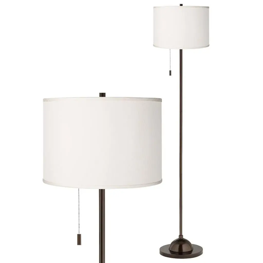 PRODUCT DETAILS: 62" high overall. Base is 11" wide. Drum shade is 13 1/2" wide x 10" high. Uses one maximum 100 watt standard-medium base light bulb (not included). On-off pull chain for easy lighting control. Club floor lamp with slim profile. From the Possini Euro Design brand of floor lamp lighting. Tiger bronze finish base and column. Metal construction. Hand-assembled shade with cream textured faux silk material. Shade fabric is constructed from polyester material. 8-foot long cord. DESCRIPTION: Add style to your favorite room with this club style floor lamp. The lamp comes in a tiger bronze finish and has a slim profile perfect for seating areas, bedrooms and more. Up top is a hand-assembled textured cream faux silk drum shade.