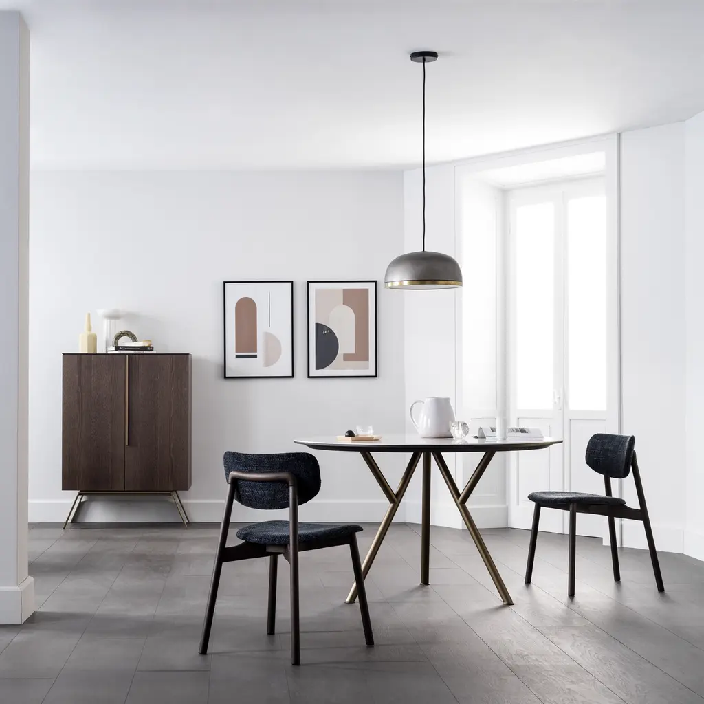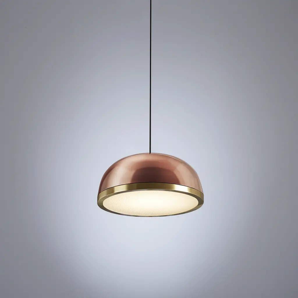 Collection of contemporary hanging, wall , floor, table, side and ceiling lamps with a painted dome and ring either painted or finished with brushed brass, copper or pewter. The bright diamond screen is made of plexiglass to better spread light out. The collection presents lamps available in three sizes for single-unit or dynamic compositions. These lamps are very versatile and fit any kind of setting, thanks to their simple shape yet rich materials.