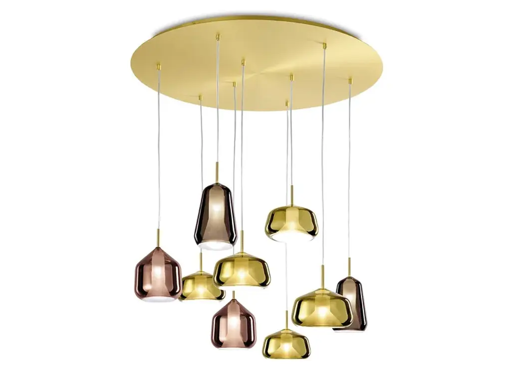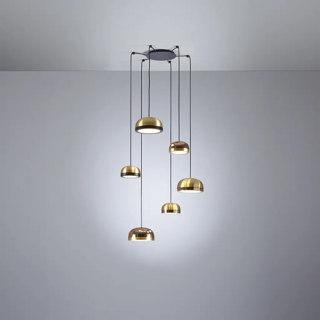 Collection of contemporary hanging, wall , floor, table, side and ceiling lamps with a painted dome and ring either painted or finished with brushed brass, copper or pewter. The bright diamond screen is made of plexiglass to better spread light out. The collection presents lamps available in three sizes for single-unit or dynamic compositions. These lamps are very versatile and fit any kind of setting, thanks to their simple shape yet rich materials.