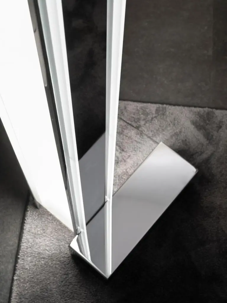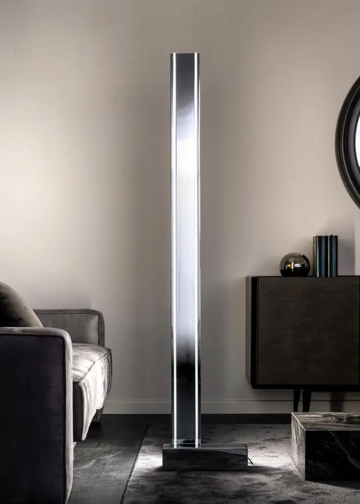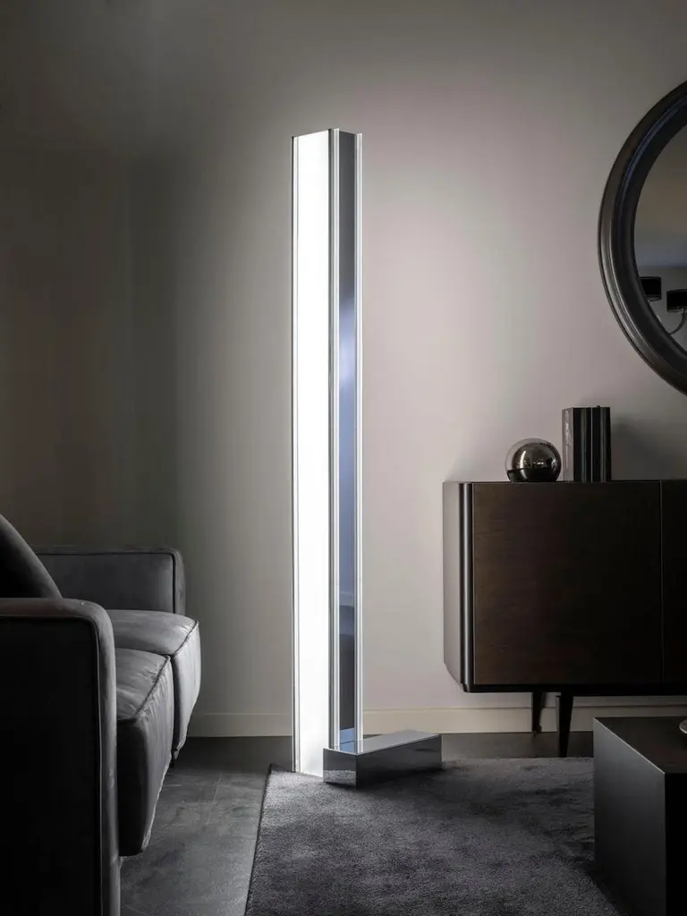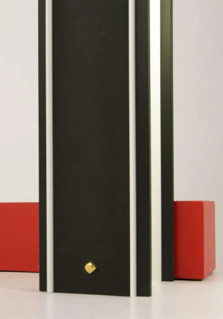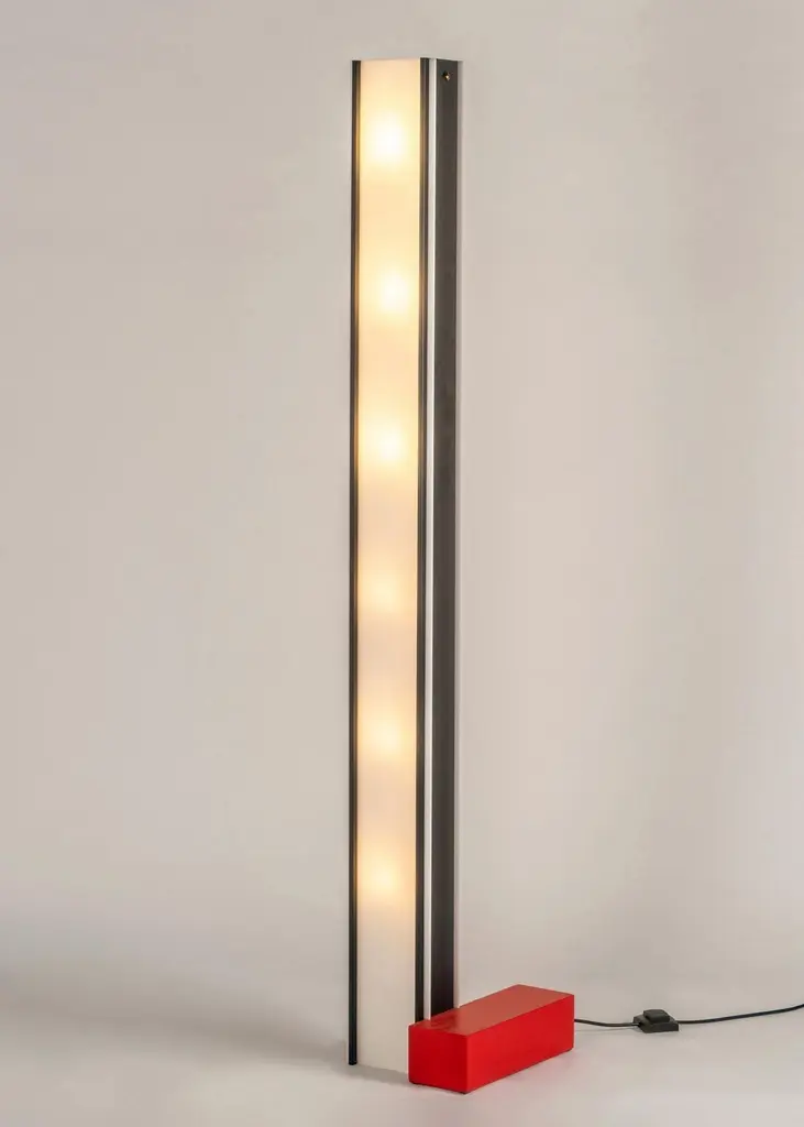 Floor lamp in black painted metal and plexiglass. The red metal base recalls the brand's iconic colors.