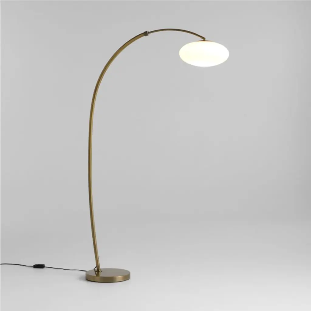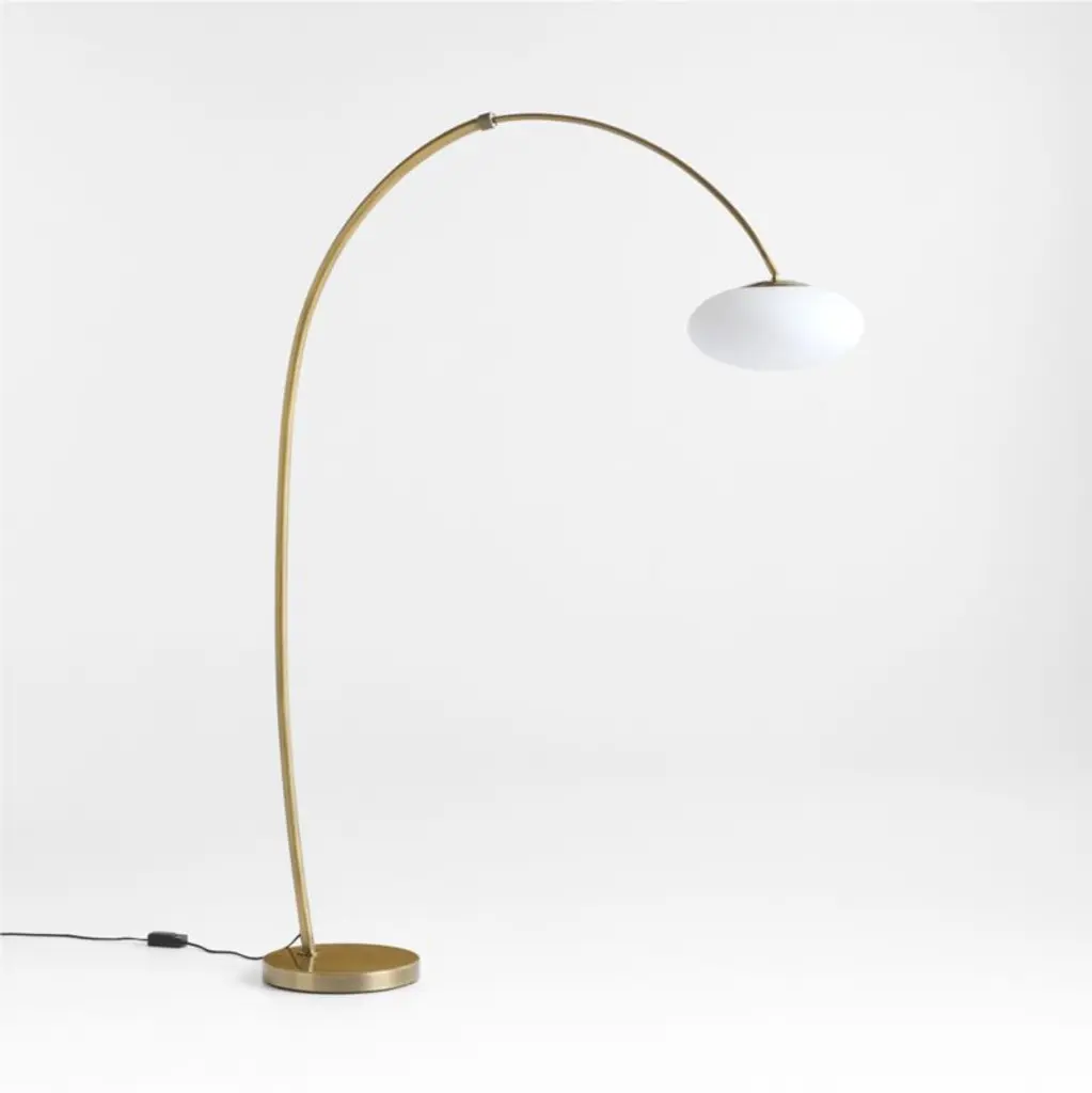 This dreamy floor lamp floats a moon-inspired shade overhead for an ethereal look. The elliptical milk glass shade is suspended by a slender, articulating arm finished in brass. Minimal and modern, the statement piece arcs gracefully over an armchair or sofaadjust its height and extension to cast a soft glow exactly where you'd like.