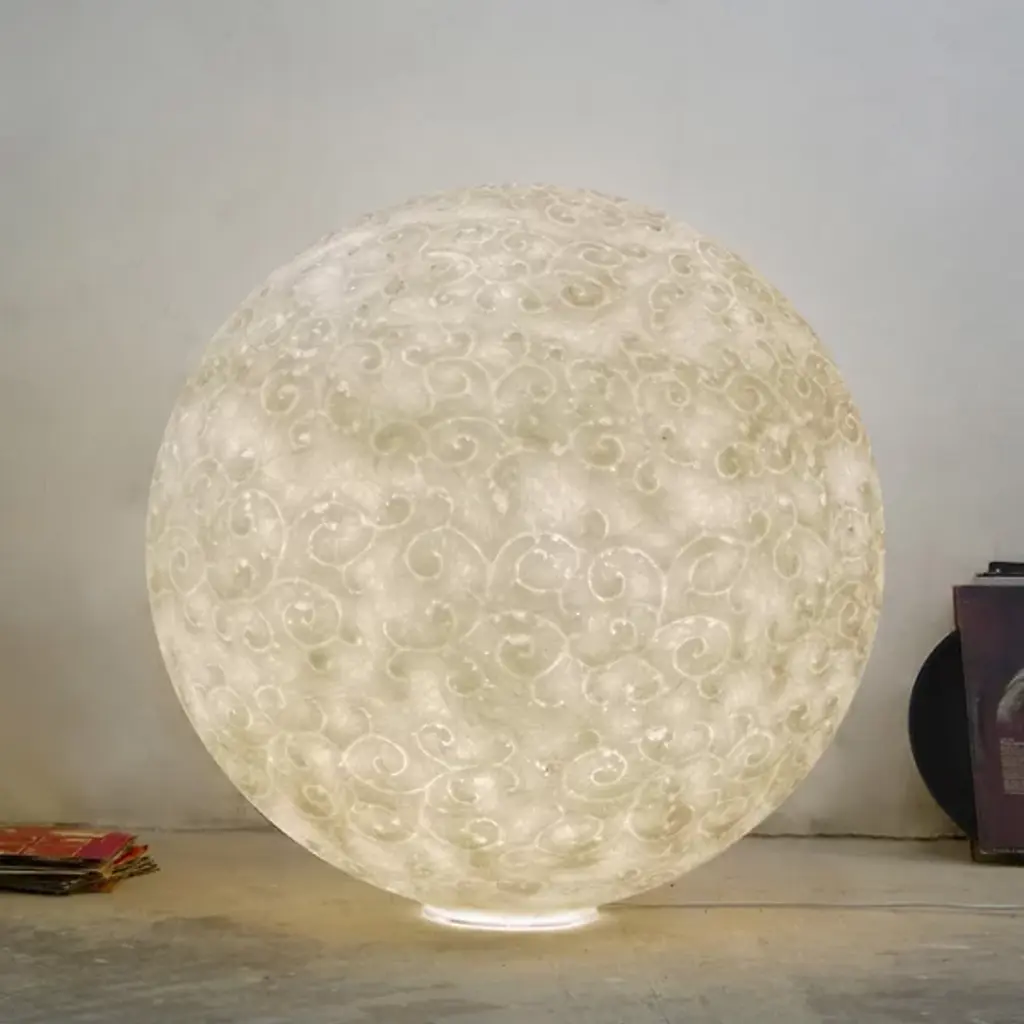Warm, textured, alluring. While the moon’s soft light glazes over your home at night, the Moon Floor Lamp from In-Es Art Design carries its nurturing and enchanting qualities into your rooms. Based in Italy, In-Es Art Design, as their name suggests, blurs the lines between art and design. Their works showcase a balance between color and materials, with a play on light and shadow. This piece highlights this idea as it’s handmade using a stretched fabric called nebulite, one made from resin and fiberglass. The nebulite’s fine texture makes it perfect for illustrating the meteor-made marks of the moon’s surface. The fibers of the material diffuse light and accentuate the familiar silhouette of our moon. The lamp generates a soft, spacious ambient glow that visually lifts your floors as it leaves a warm-hued glaze over the surface.