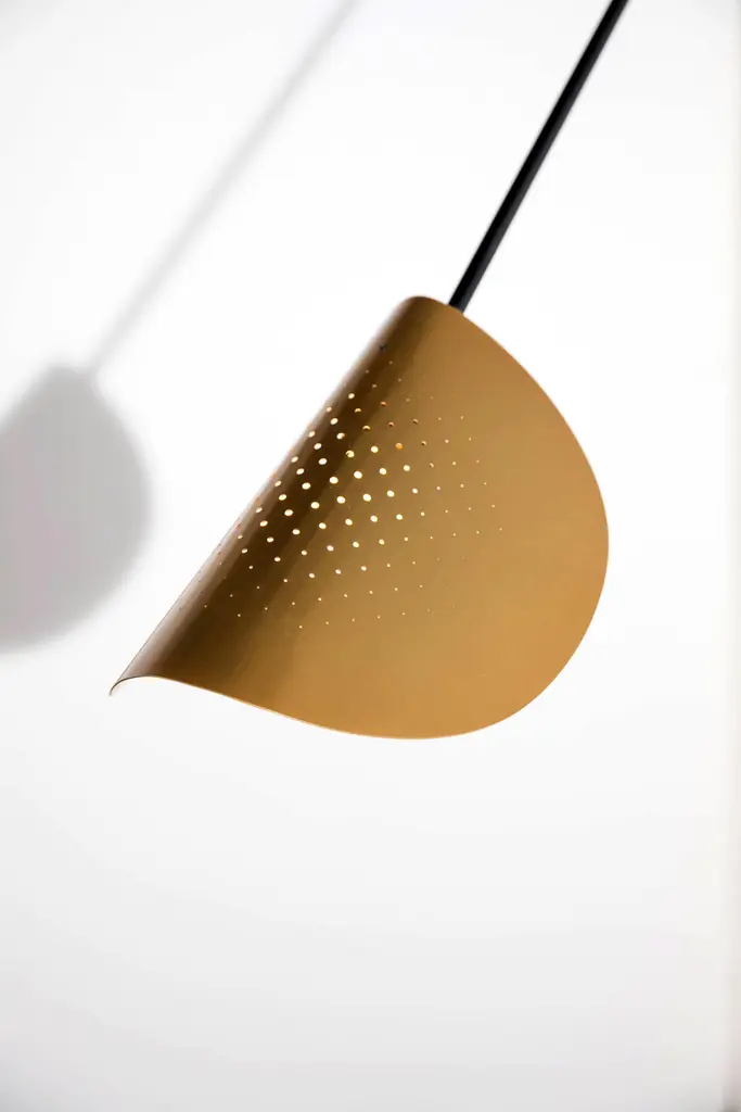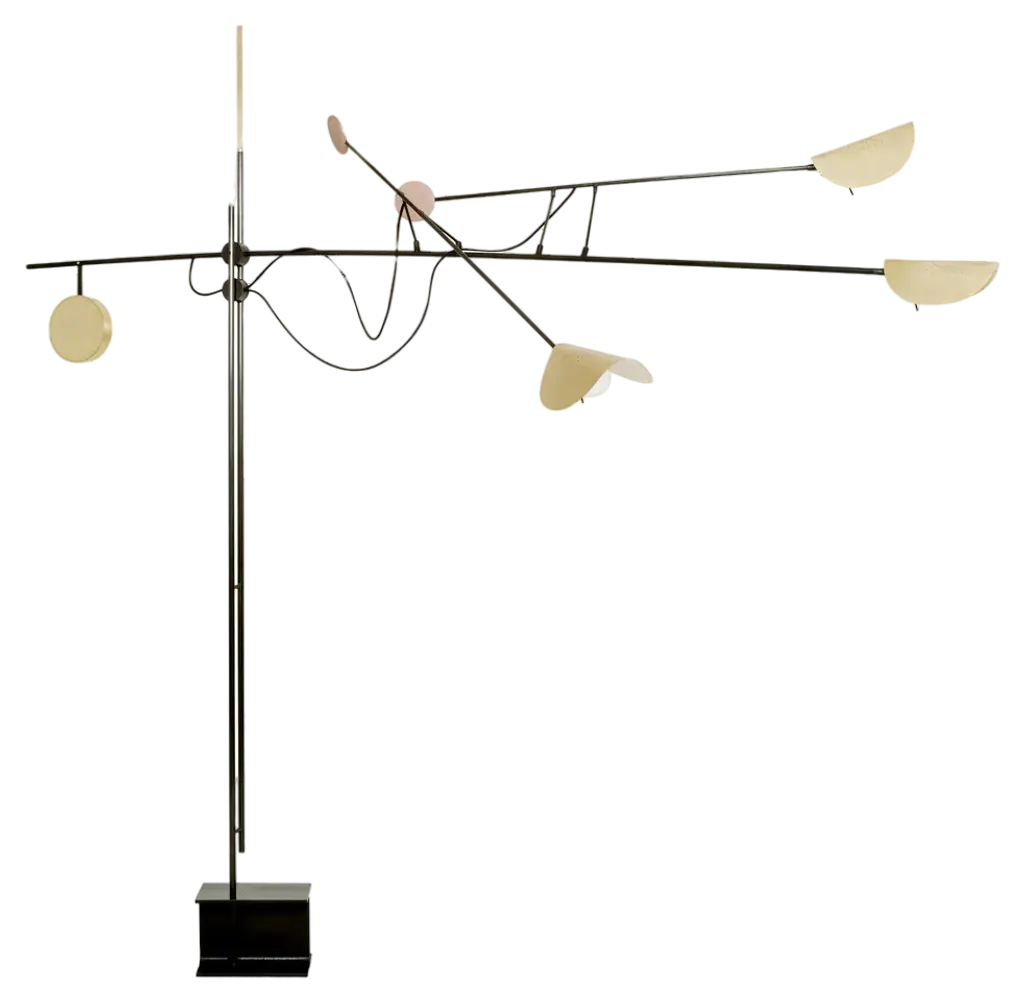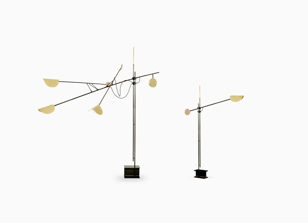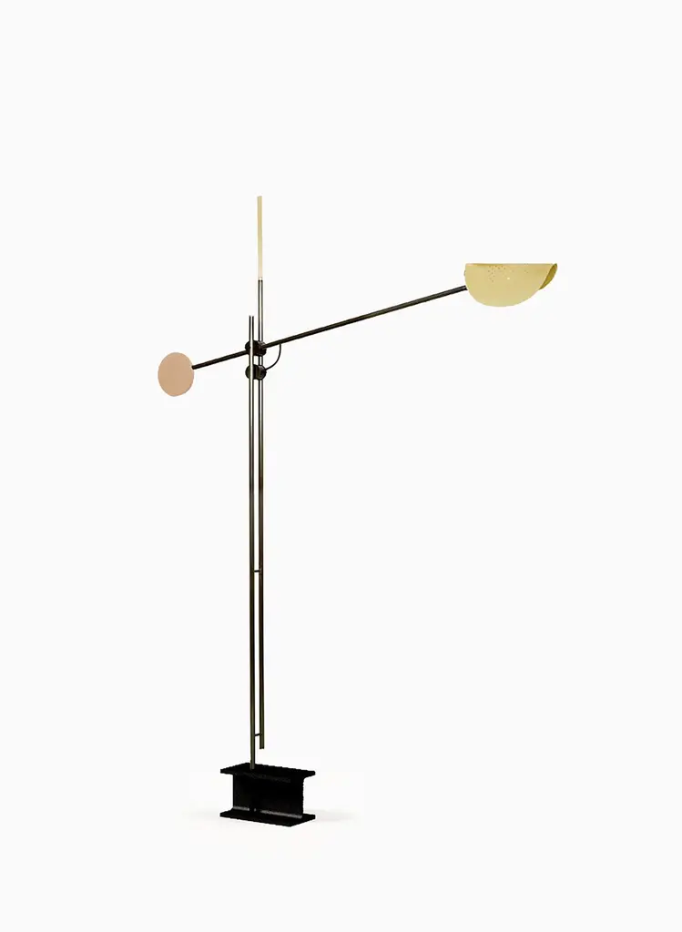 Moon floor lamp (XL) by SB26Dimensions: W 250 x D 130 x H 250 cmMaterials: Steel, copper, brass gilded with pure gold.Moon is balanced in space and refined to its worked ends which gives it bright and colorful reflections.This reader plays also on the contrasts, whether on its construction, between the Industrial ironwork and the ironwork of art, but also in the games of rhythms and materials. The entire steel structure has an oiled finish and silky touch.The ends are made of copper and brass gilded with pure gold.SB26 is the brand created in 2018 by the designer Samuel Accoceberry and the blacksmith Bruce Cecere. This birth originates in the desire of Bruce Cecere to design and present an exceptional object during a program of co-creation Craftsman / Designer.For this, he chooses Samuel Accoceberry, renowned designer not only for his collaborations with major brands but also for his concern to promote the great know-how and their authors. Together, they explored the limits of metal work, such as goldsmiths, to create the line of luminaires Moon which one of the pieces was presented at the Milan Salon in 2018.To continue their collaboration and develop new projects, they create their joint signature SB26 (Samuel Accoceberry & Bruce Cecere Studio).