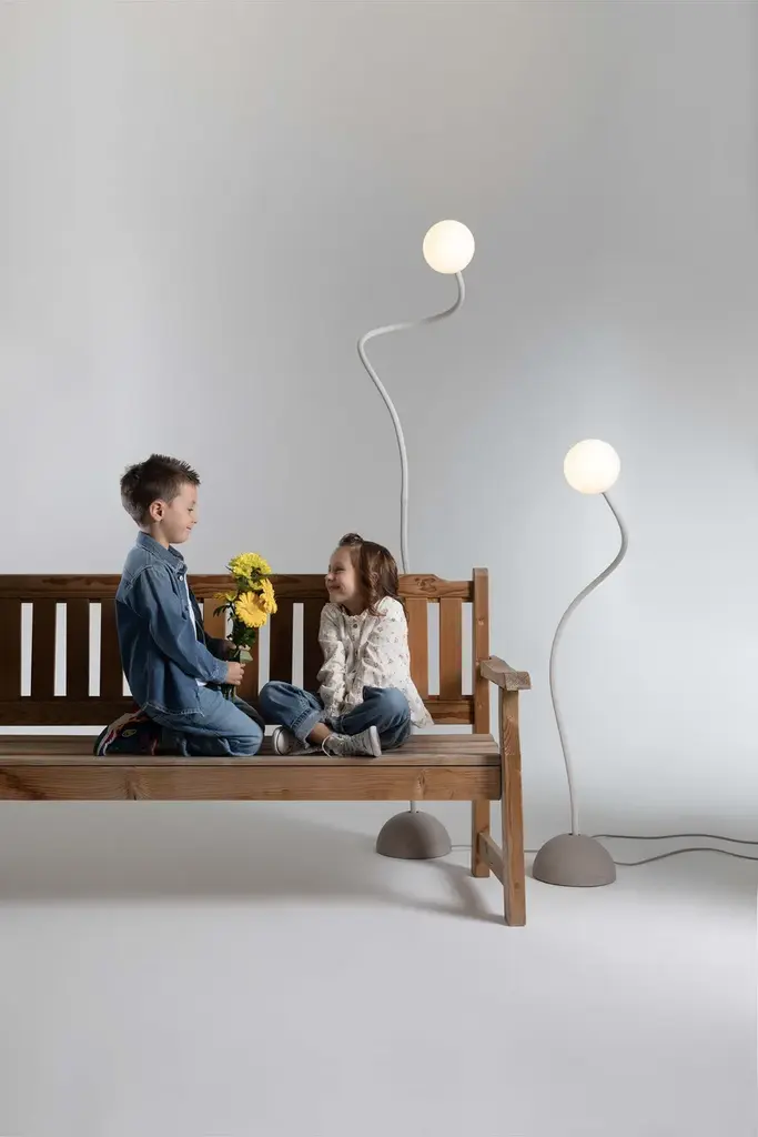 Moony is a floor lamp for indoor use, with flexible arm, made of PMMA. Marcantonio design.Technical featuresCategory: IndoorTypology: FloorLight Source: LEDE27 1x max 7W LED, IP20 (bulb not provided)Material: metal rod, covered with white canvas, globe diffuser in white frosted, and floor base in cementDescription: Diffuser in frosted PMMA, basement in concreteWhen you have the moon and you’d like to change your mood, then all you need to do is move Moony, which reflects different states of mind.Moony by Marcantonio shows its best side by adapting to moods, thanks to its flexible arm.A versatile family, set out in single-arm applique fittings, a free-standing lamp in two heights, and a down light with single, three or even five arms to suit more complex personalities.The floor version faces upwards to the ceiling or is bent on itself, like a reading lamp. The applique version can be directed as needed, with the three- or five-arm fittings that are freed from a small cylinder secured to the ceiling, or any way your creativity can offer.The mobile rod in metal, with a white covering supports a frosted globe containing the LED light source.The semisphere base in cement offers two heights for the Moony floor lamp.