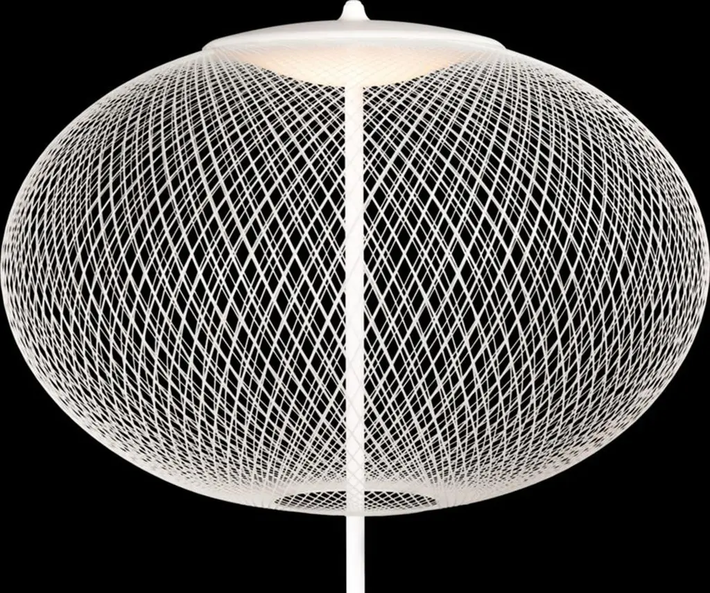 Like its suspended family members, the NR2 Floor Lamp, by Bertjan Pot, sports an elegant and bright oval-shaped bubble of white or black thread. Thanks to the airy lattice pattern of the bubble and the sleek steel column, the NR2 Floor Lamp doesn’t block any views. Put this versatile design in any place that needs brightening up, such as a dark hallway or next to your favourite reading spot. The integrated LED lamp in NR2 subtly diffuses a soft and magical glow. NR2 Floor Lamp is available in two different colours. Ellipsoid from fiberglass with epoxy resin, ABS cover, PC diffuser and aluminum heatsink on a powdercoated steel stand.See the world from your own elegant and lighthearted bubble: the NR2 is now available as a floor light. Thanks to an integrated LED light, this new creation by Bertjan Pot subtly diffuses its soft, magic glow around the room.Additional information:Materials: Fiberglass, epoxy resin, ABS, PC, aluminum, steelFinish: WhiteEnergy labal: Energy Label BLight source type: LEDNumber of light sources: 1Input voltage: 120VFrequency: 50/60Max power consumption: 16WDimmable: YesCRI: 82Light output: 450 lmColour temperature: 2700 KLamp holder: LED (Solid State)Plug type: US plug (Type A)Switch: In line slide dimmer with on/off switchCable colour: BlackCable length: 350cm 137.8"Light direction: All directionsDiameter shade: 56cm 22"Dimensions: Ø 56 x 164 H cmAvailable in other finish option: Black.