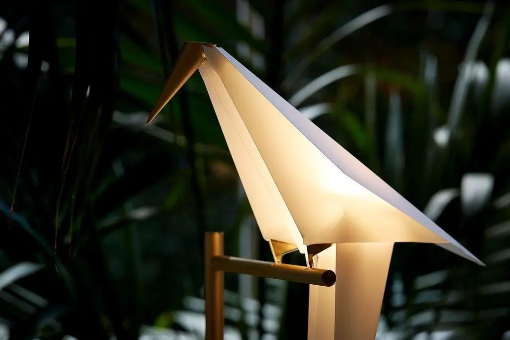 Look up, into the soft light, follow the fluttering sound and sparks of movement. A bird is gracefully balanced on a tall metal perch, beautiful and proud, a swinging glimmer of warm light... yet you are inside, after daylight has faded, under the spell of the Perch Light Floor Lamp! This sunlit bird is free to swing when softly touched. It gently glows and brings along the promise of spring. Steel and aluminium frame with polycarbonate (PC) and synthetic paper birdsAdditional information:Materials: Steel, aluminium, polycarbonateFinish: Brass and whiteEnergy labal: Energy Label BLight source type: LEDNumber of light sources: 1Light source included: YesLight output: 150 lmInput voltage: 100-240VFrequency: 50/60Max power consumption: 5WCRI: 80Dimmable: NoLamp holder: LED (Solid State)Plug type: US plug (Type A)Switch: In line on/off switchLifetime: 50000 hoursColour temperature: 3000 KCable colour: BlackCable length: 450cm 177.2"Light direction: All directionsDimensions: 28 W x 33 D x 164 H cm.