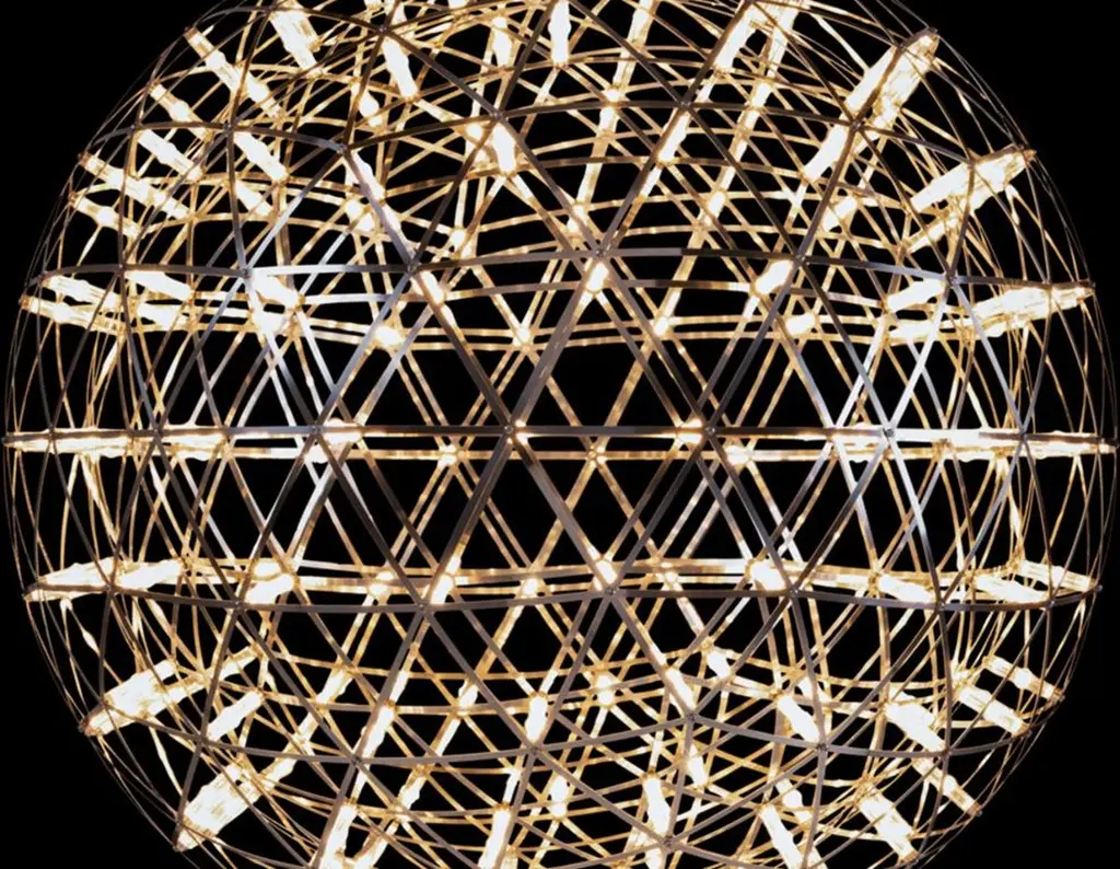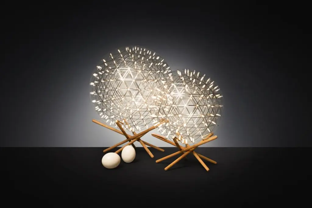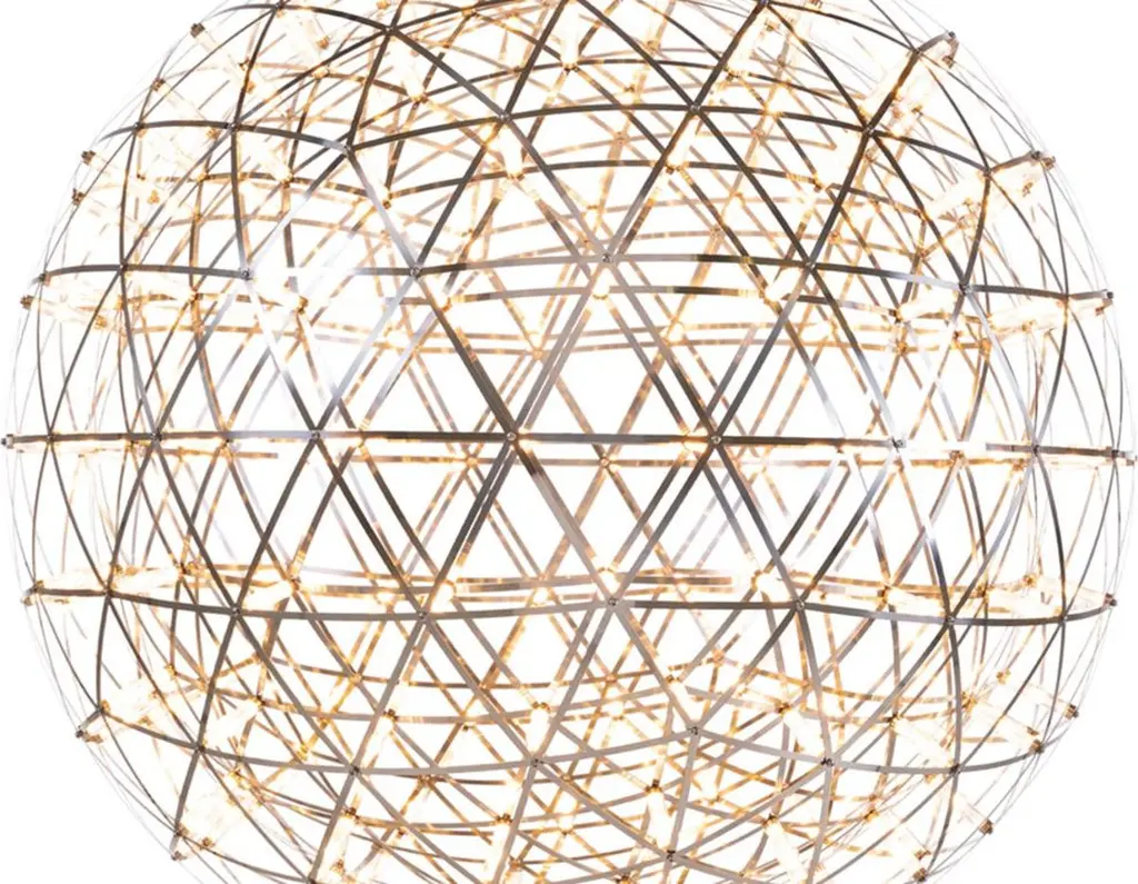 The Raimond Tensegrity is a floor lamp made from elegant metal, complemented with the sturdy earthiness of wood. Tensegrity is a term that was first described by Buckminster Fuller as an architectural term. It refers to the interconnected wooden structure that uses tension and pressure to keep its shape. The beauty of the Raimond Tensegrity lies not only in its contrasting materials, but also in the trigonometric harmony of both structures. Mathematical perfection times two. Stainless Steel Sphere with PMMA lenses, wooden legs and leather strapsAdditional information:Materials: Stainless steel, wood, leatherEnergy label: Energy label BLight source type: LEDLight source included: YesNumber of light sources: 252Input voltage: 120-250VLight output: 1744 lmFrequency: 50/60CRI: 92Max power consumption: 26WDimmable: YesLamp holder: LED (Solid State)Switch: In line dimmer switch integrated in power supply housingColour temperature: 2523 KCable colour: Transparent with tinned coresCable length: 500cm 196.9"Lifetime: 50000 hoursLight direction: All directionsDimensions: Ø 61 x 80 H cmAvailable in other size option: Small.