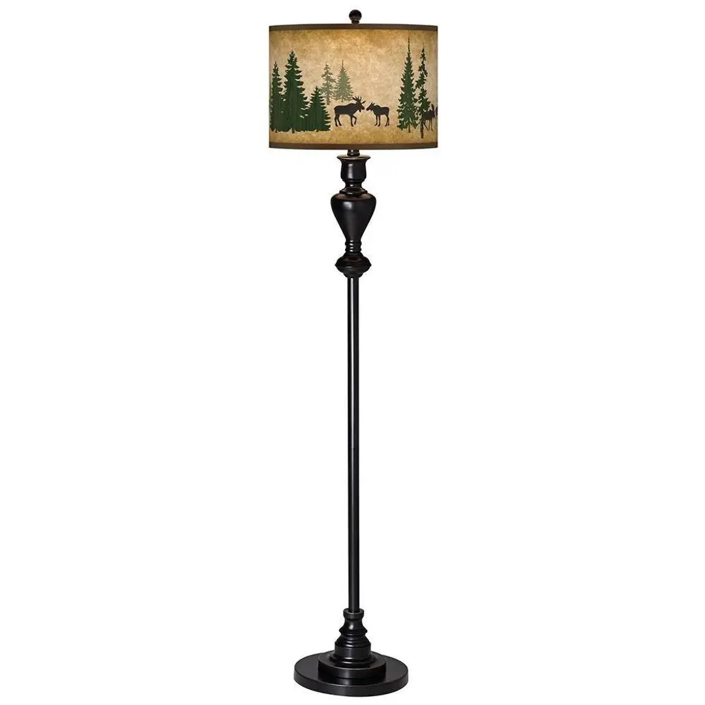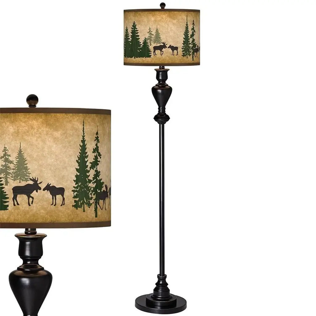 PRODUCT DETAILS: Overall: 58" high. Shade is 13" wide x 10" high. Base is 10" wide. Takes one maximum 150 watt bulb (not included). Stylish floor perfect for living rooms, family rooms, and more. Black bronze finish with soft gold edging. Metal construction. Custom-printed giclee lamp shade with Moose Lodge pattern. DESCRIPTION: Add a stylish and unique accent to your living space with this shapely floor lamp which is topped off with our patented Moose Lodge pattern giclee shade. Warm light shines through illuminating the pattern and creating a truly distinctive look.