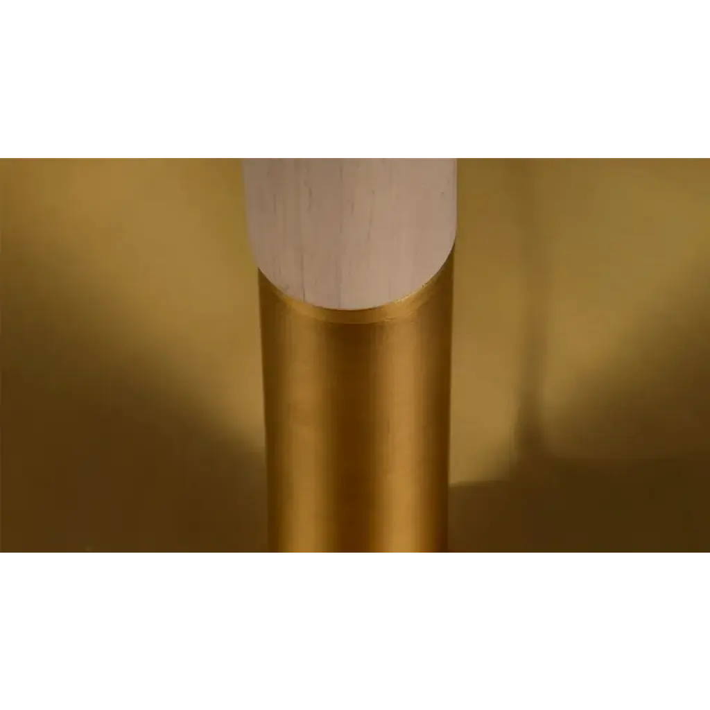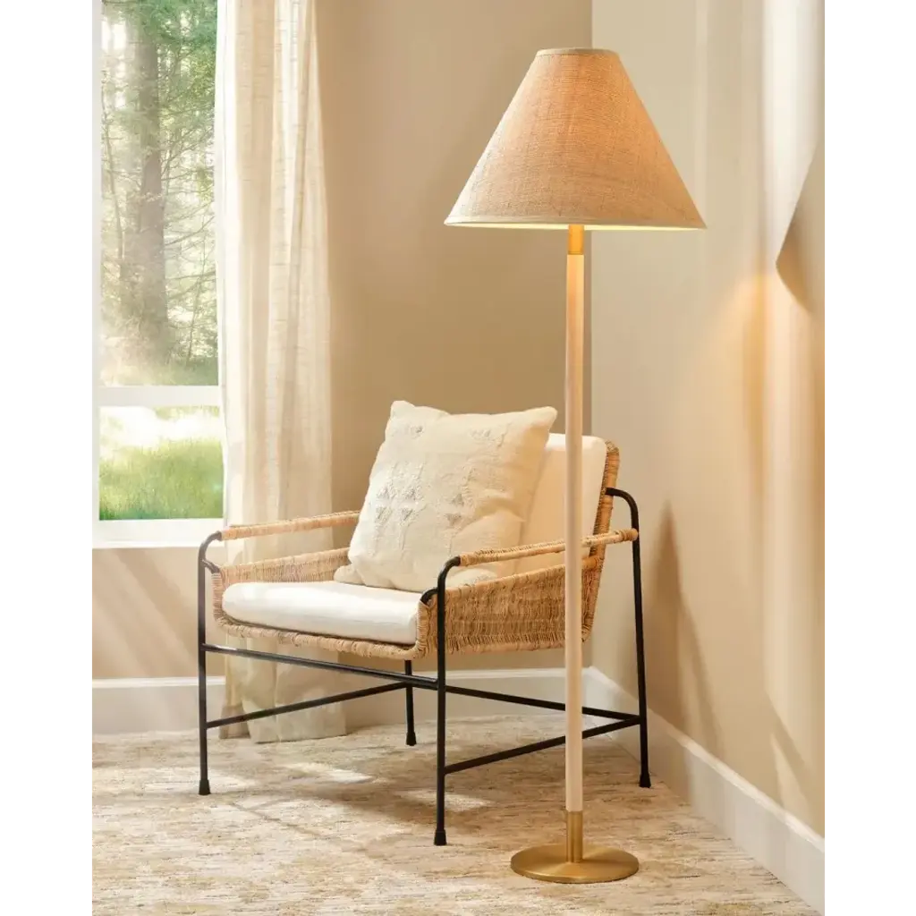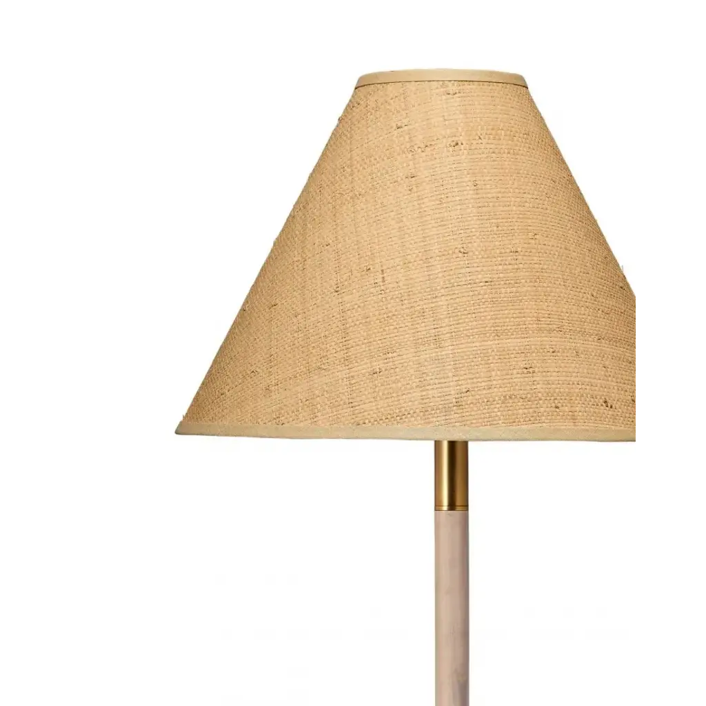 A medley of modern materials, this floor lamp pairs wood with metal and natural fibers for a look that manages to be both timeless and contemporary. The slim wood base is accented with warm gold. The dramatically angled cone shade is hand-woven of natural raffia.
