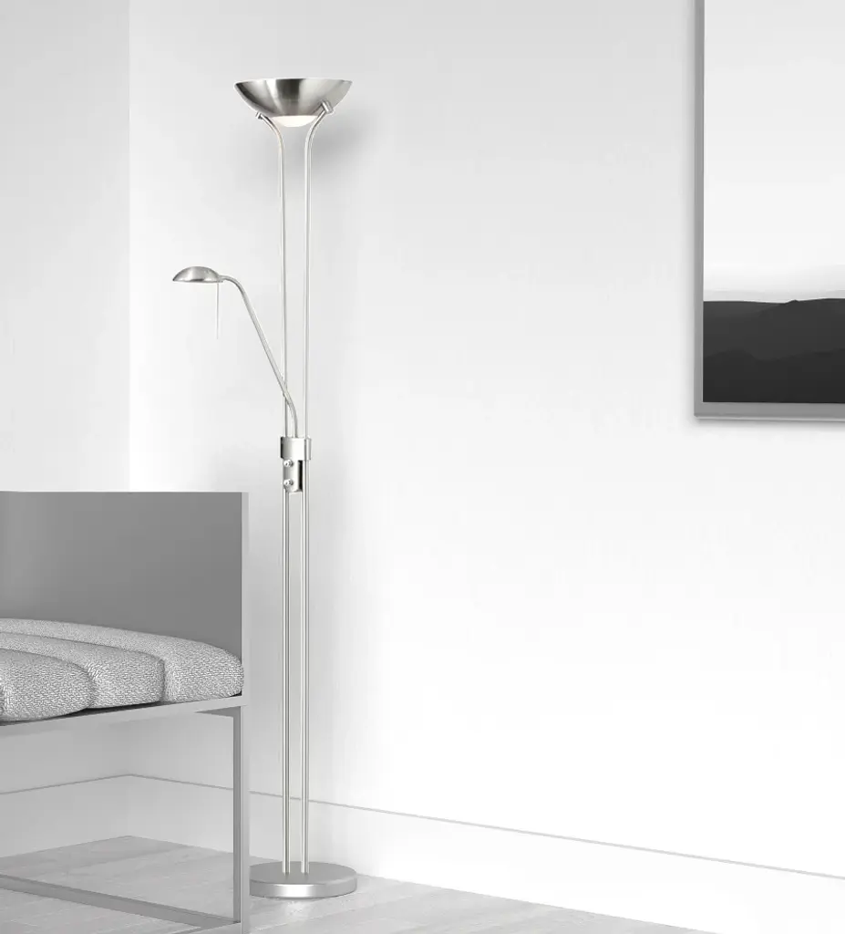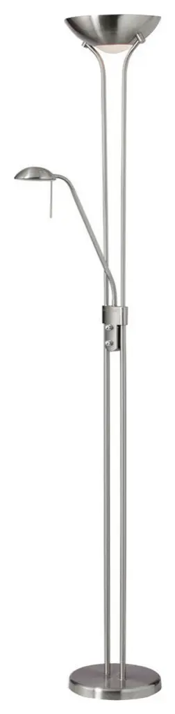Illuminate a bedroom or living space with the Mother and Son Floor Lamp. Made from steel in a satin chrome finish with an extra adjustable gooseneck lamp, this floor lamp is striking and unique. Display it among pieces of contemporary decor for a cohesive look. Dimensions: W 10" x D 10" x H 71"Genre: ContemporaryItem Category: Floor LampCanopy/Back Plate/Base Height: 1.5"Canopy/Back Plate/Base Diameter: 10"Canopy/Back Plate/Base Color: Satin ChromeHeight/Vertically Adjustable: YesDepth/Horizontally Adjustable: YesType of Extension: GooseneckExtension Length/Reach: 15Installation Position: FloorNo. of Bulbs: 3Total Wattage: 240WBulb 1 Amount: 1Bulb 1 Base Type: A Type - E26 BaseBulb 1 Max Wattage: 40WBulb 1 Included: NoBulb 2 Amount: 2Bulb 2 Base Type: A Type -E26 BaseBulb 2 Included: YesDimmable: YesDimmer Included: YesRecommended Dimmer: Rotary Dimmer SwitchVo Lightage: 120VUL Approved: YesCSA Approved: YesRated For: Dry LocationConnection Type: Plug InType of Switch: Uplight Dimmer SwitchUPS-able: YesUplight Only DimsTools Required: YesParts Required: NoWarranty: 1 YearCommercial Use: Yes