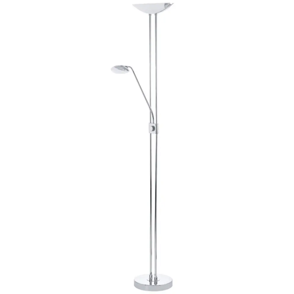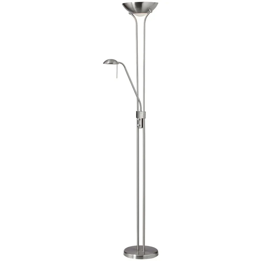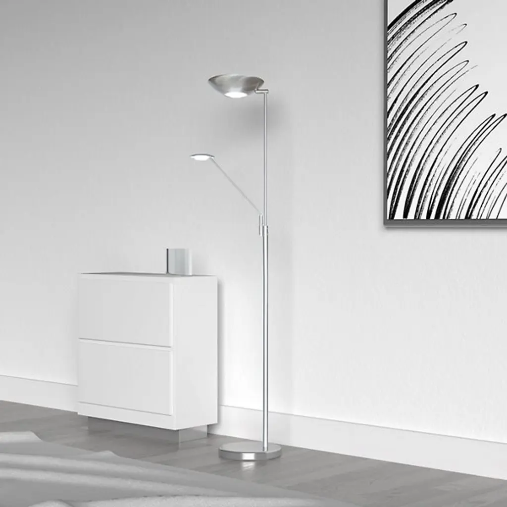 The Mother & Son LED Floor Lamp by Dainolite is a sleek design with a steel base, supporting a pair of lights that add both direct and indirect lighting to your spaces. With a slender, minimalistic silhouette, a tall post is topped with a disk-shaped shade that acts as a classic torchiere lamp while a second arm extends outward to offer a focused layer of illumination that can be adjusted. A handsome finish completes this versatile piece as it offers a mix of form and function to its surroundings.