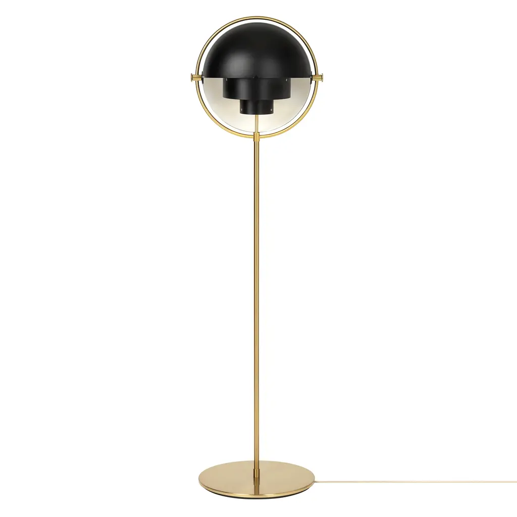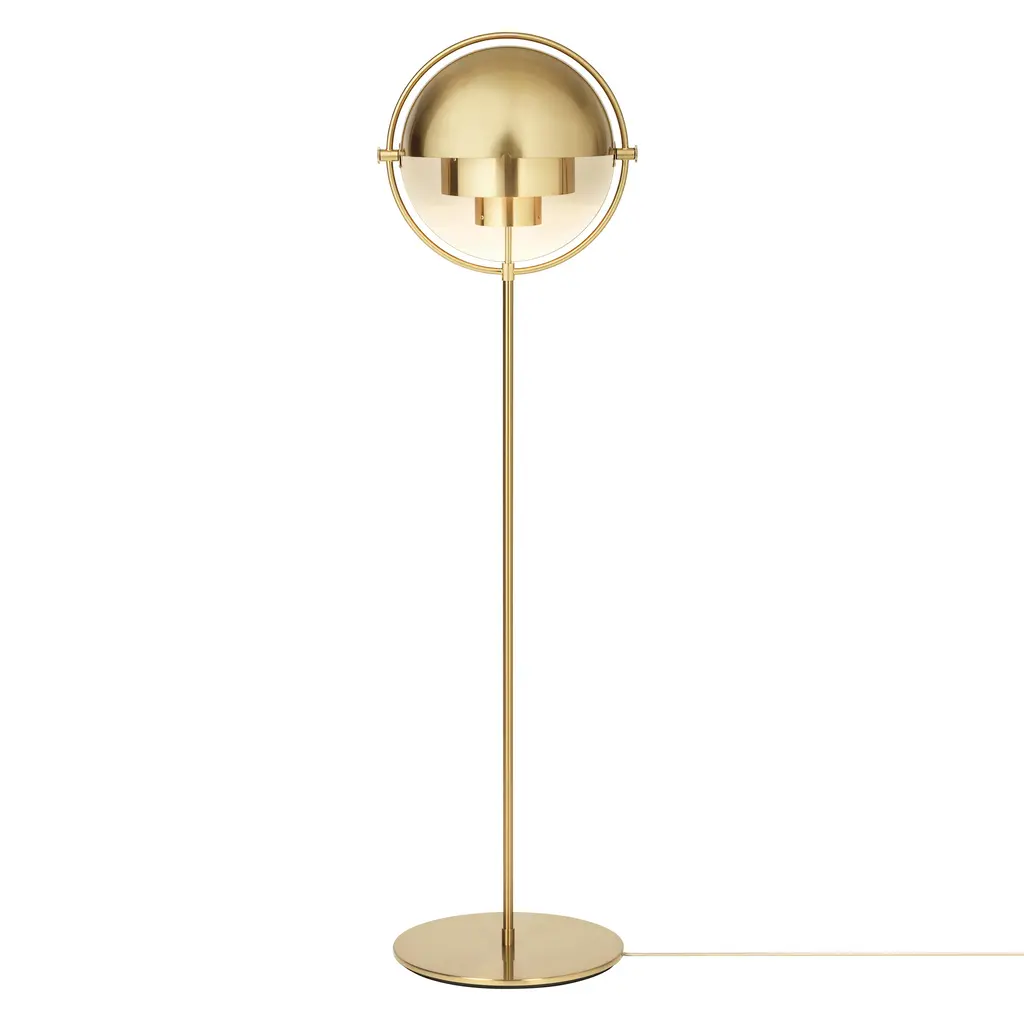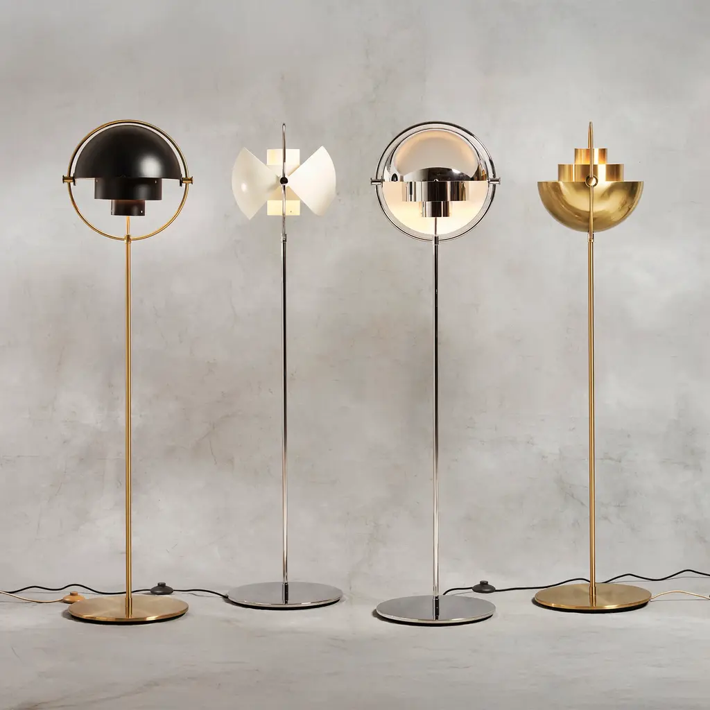 With an iconic silhouette derived from multiple rounded metal shades, Louis Weisdorf's circa-1972 Multi-Lite makes for an standout floor lamp. With repetition of a single element as a constant theme, the designer focused on both form and function in the golden era of Danish style. The rotating metal shades attached to the brass framework can be aimed up or down—or in combination—to direct the light as desired. Weisdorf's equal emphasis on utility assures that the eye is also shielded from direct bulb glare at all angles.
