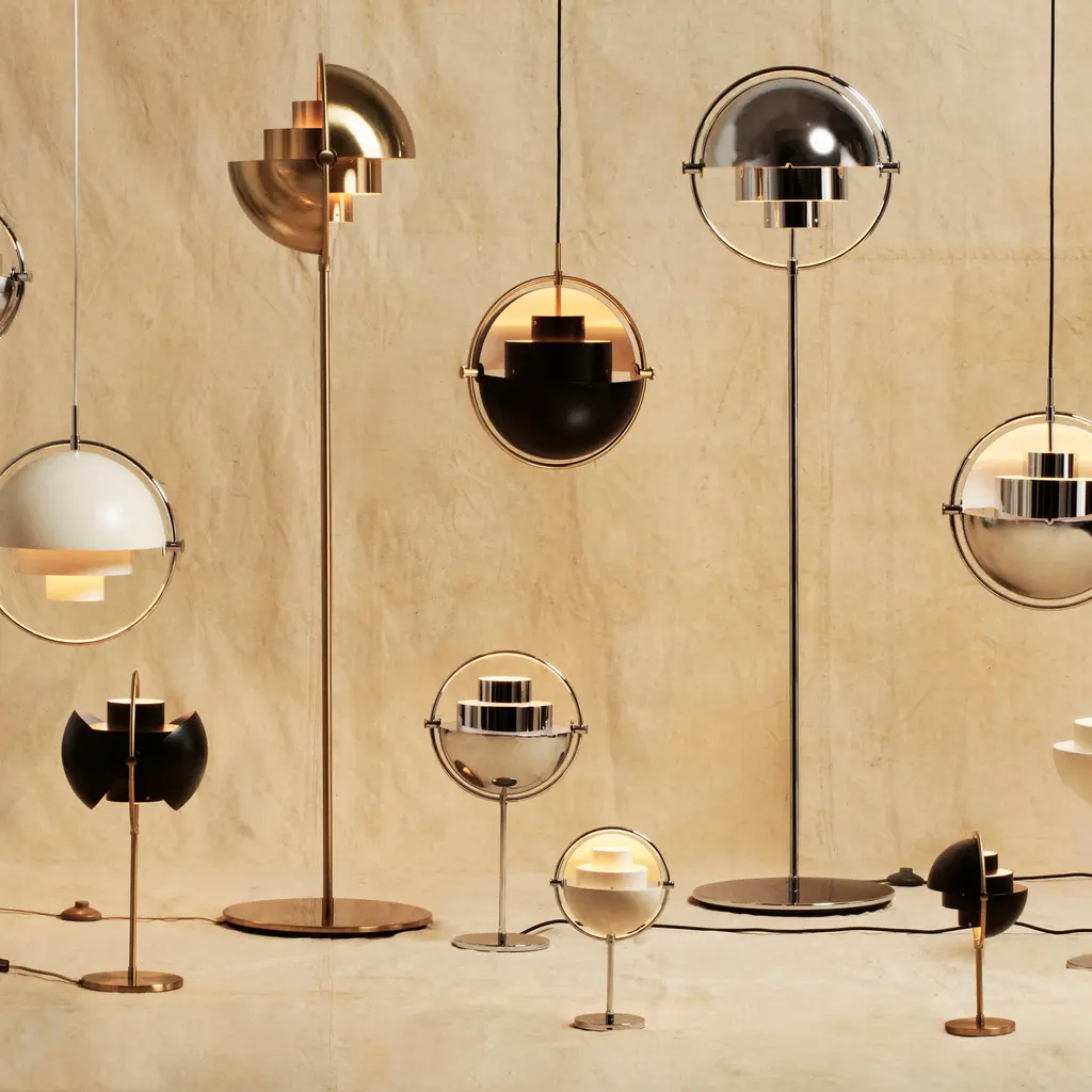 With an iconic silhouette derived from multiple rounded metal shades, Louis Weisdorf's circa-1972 Multi-Lite makes for an standout floor lamp. With repetition of a single element as a constant theme, the designer focused on both form and function in the golden era of Danish style. The rotating metal shades attached to the brass framework can be aimed up or down—or in combination—to direct the light as desired. Weisdorf's equal emphasis on utility assures that the eye is also shielded from direct bulb glare at all angles.